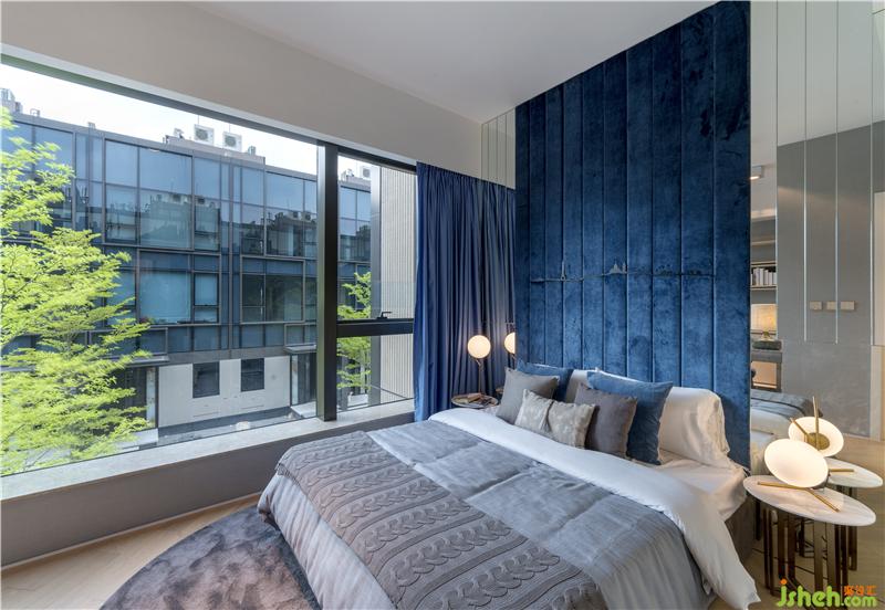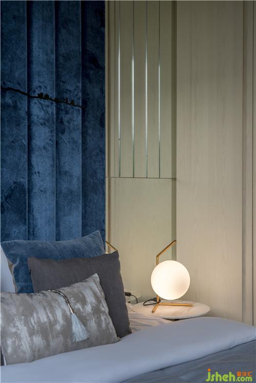 同層右側(cè)區(qū)域的次臥,以摩登現(xiàn)代的港式風格作為裝潢基調(diào),選材以布木為主,輔以金屬。布局于背墻中央的藍色布藝沉穩(wěn)內(nèi)斂、不動聲色,一鏡到頂、分置床頭的金屬鏡墻色厲內(nèi)荏、倒影暖光,布藝的質(zhì)樸與金屬的藝術碰撞出現(xiàn)代,藍的冷凝與光的氤氳相遇出復古,共處一室成為現(xiàn)代的復古。