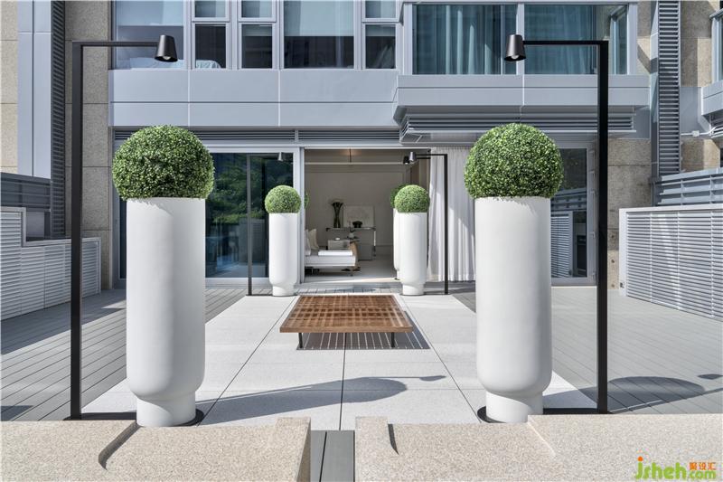 戶外光源設(shè)置同樣突顯設(shè)計(jì)巧思,六根Bodoni字體C形燈柱,為庭院的中軸景觀鑲上啞黑邊框,在一片素白底色中裁剪出立體感。