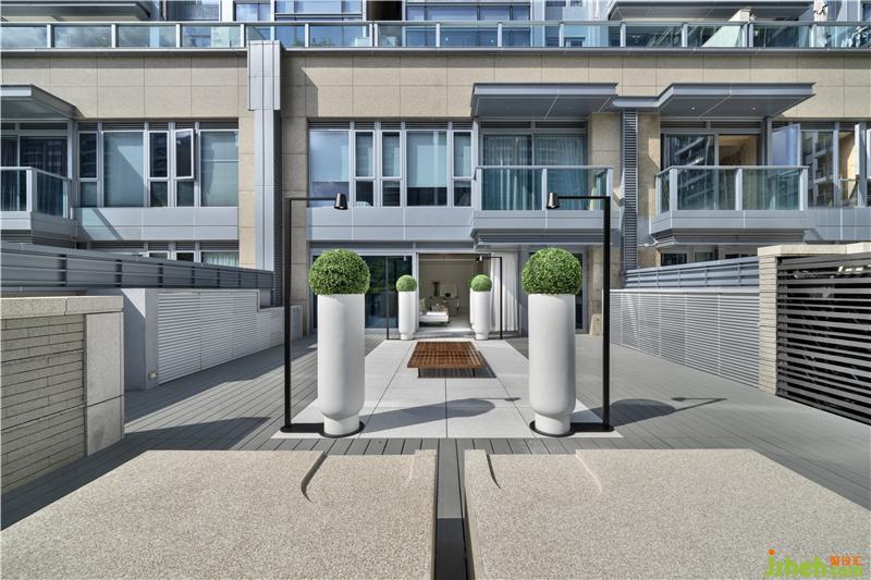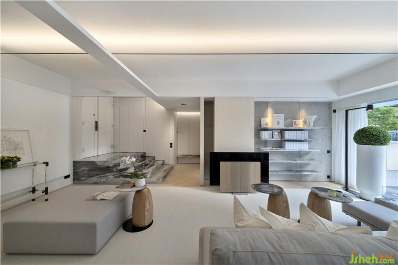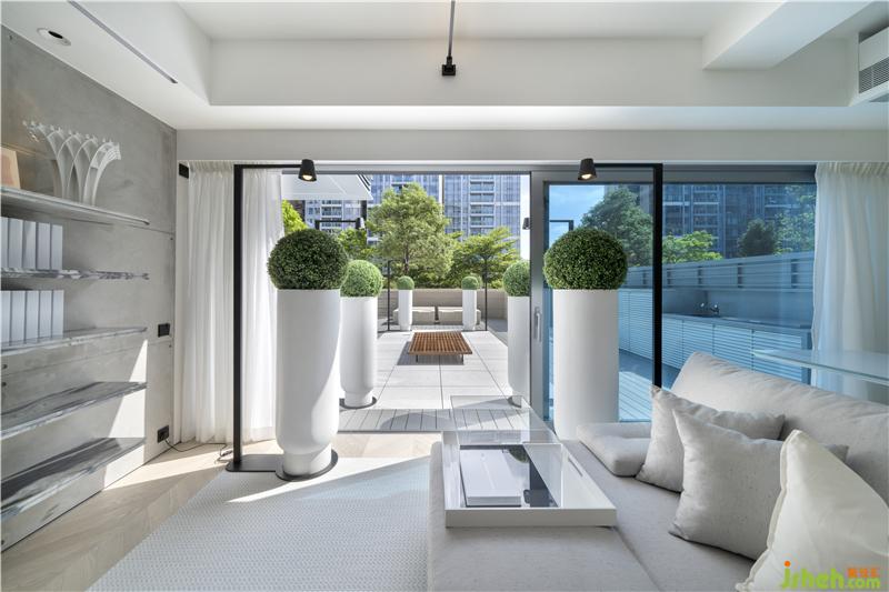 由庭院入戶是打開這間用心之作的最佳選擇,你可以發(fā)現(xiàn)Danny團(tuán)隊(duì)“小心思”里的“大布局”。設(shè)計(jì)師沿庭院中軸線靈活地運(yùn)用了多組對(duì)稱排列:中部由外至內(nèi)對(duì)應(yīng)布局兩處休憩區(qū),一塊碩大的金色麻石一分為四,細(xì)節(jié)粗糲、香港別墅裝飾沉穩(wěn)而厚重,與之呼應(yīng)的是庭院中央一方較小的實(shí)木矮凳,質(zhì)感細(xì)膩、色厲而內(nèi)荏;分立兩側(cè)的三組巨型花筒,一字排開,延伸入室,素白的超高桶身與蔥郁的渾圓花球,柔和了此前矮凳尖銳的幾何突觸,并與粗點(diǎn)白麻石的地磚一起為戶外空間奠定了素雅大氣的色調(diào)氛圍;