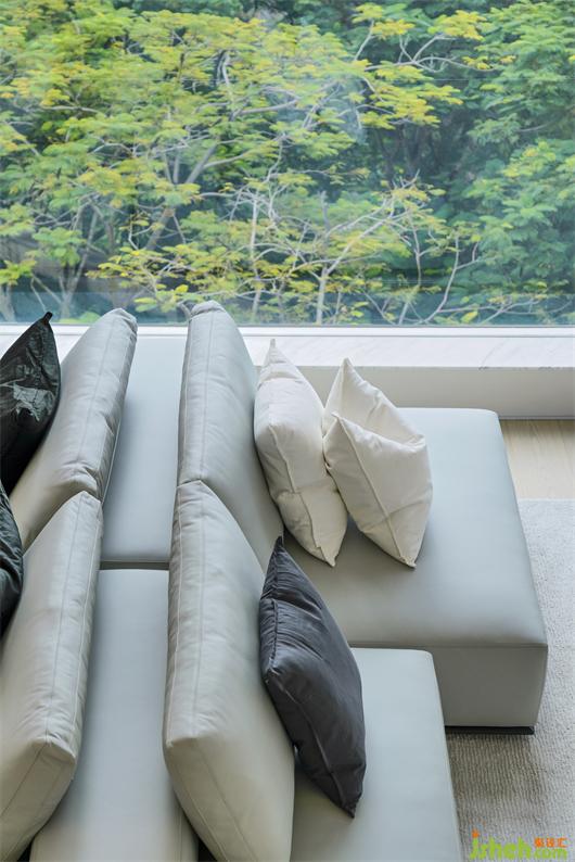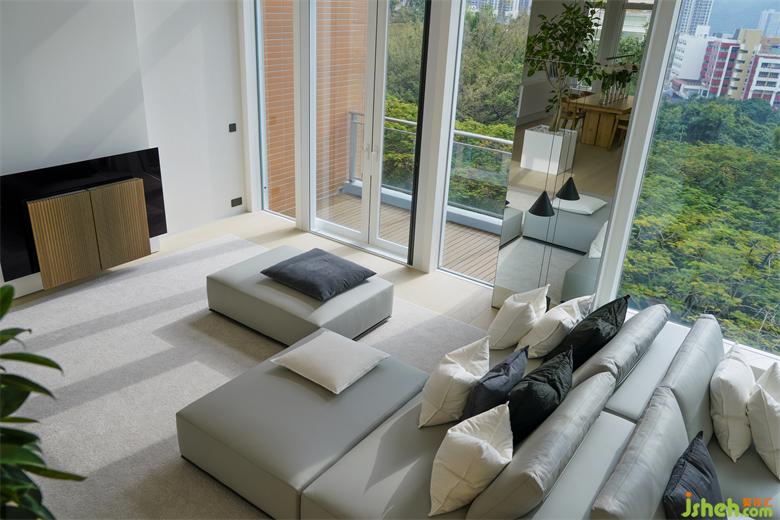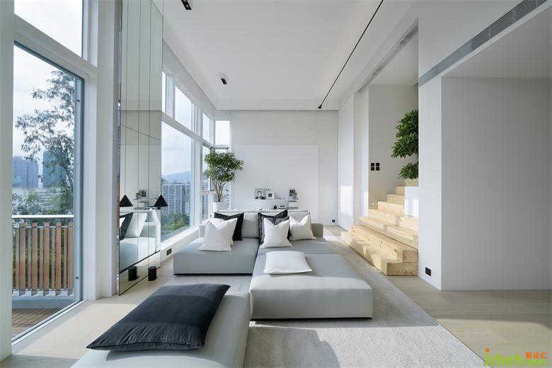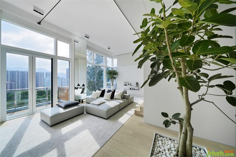 客廳是家庭社交起居的核心。香港頂復(fù)設(shè)計師因地制宜,充分運用空間薄進深、大面寬、高挑空的形制特點,發(fā)揮房屋南北通透的格局優(yōu)勢,在四面裝配落地觀景大窗,既輕松優(yōu)化采光通風品質(zhì),又讓居住者無論身處客廳哪個位置,都能與戶外風光和清新空氣自然親近。