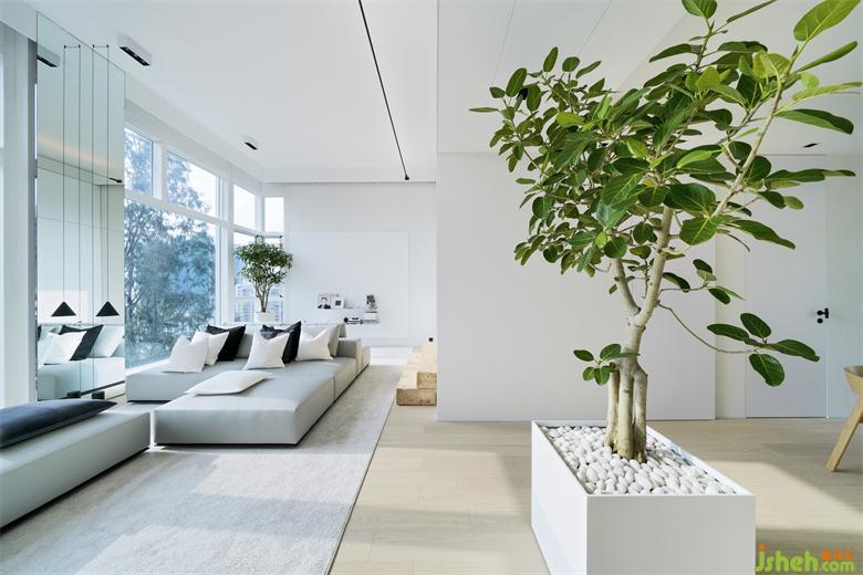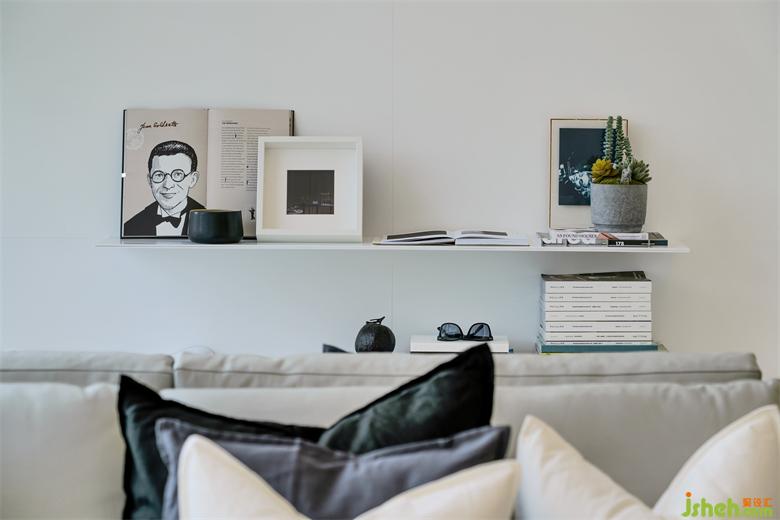 客廳盡頭是一整片白色墻面,設計師為避免單調,凸出墻體嵌置了一塊形制相同、略小一號的鋁制面板,并在與沙發(fā)平齊的高度,裝上置物架,擺上幾件不具名的小物件兒。這樣一來,眼睛便有了交點,平面便有了凸點,空間便有了亮點。