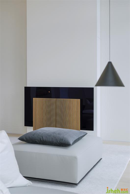 在另一邊,平平無奇的電視墻,實則是隱藏的收納柜。同樣是凸出墻體,打造裸眼的3D效果,與對面墻體遙相呼應。