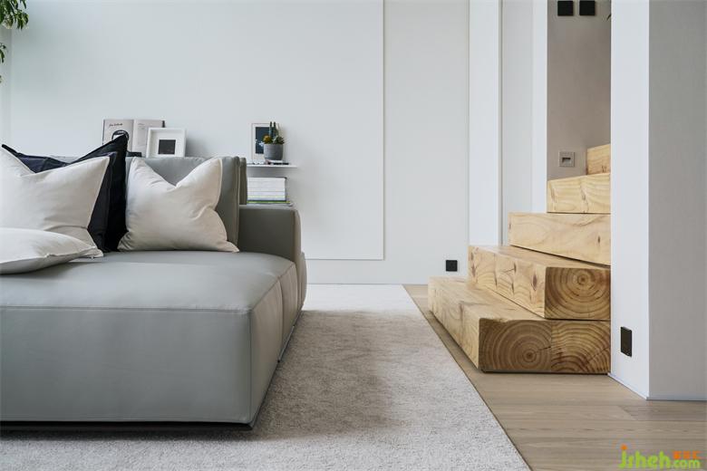 香港頂復設計木質感是貫穿全屋軟裝的又一主題,從餐廳的實木長桌,滿鋪的燕麥色地板,到隔墻錯落的木本綠植,再到由8根新西蘭松木疊綴而成的樓梯……項目的主理設計師Danny介紹到,在空間中大量的植入木質元素,用木的紋路、手感和溫度去中和空間里的單調冷意,讓簡約不簡單,讓感官刺激飽和。