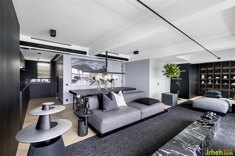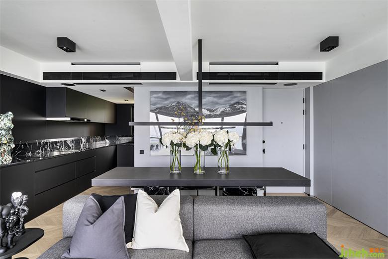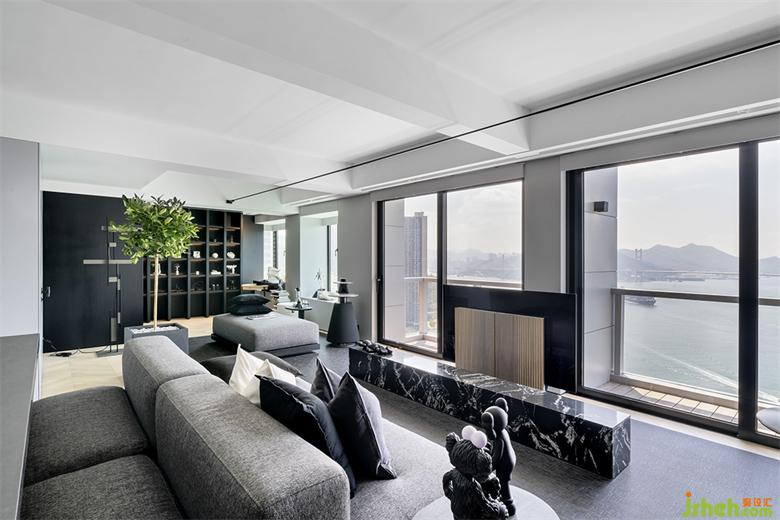 順應(yīng)空間的走勢,香港私宅設(shè)計(jì)從定制的餐桌到矮背設(shè)計(jì)的灰色沙發(fā),可升降的B&O品牌電視等,不失美感也避免遮擋觀景視線,無論是日常宅家還是朋友聚餐,都能將遼闊的大海景色盡收眼底,創(chuàng)造輕松自由、多元互動的空間體驗(yàn)。