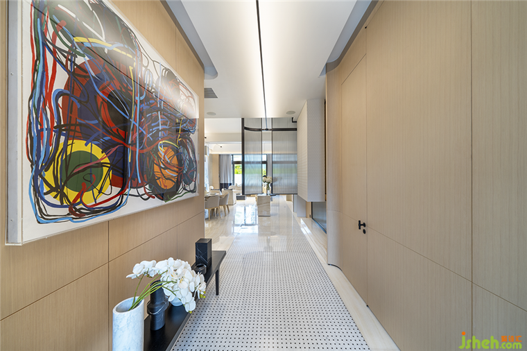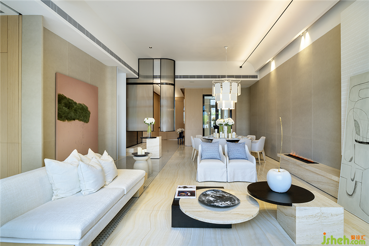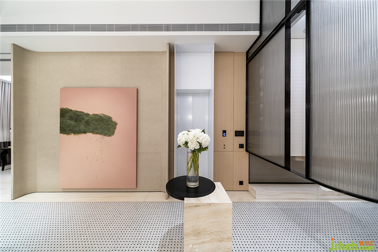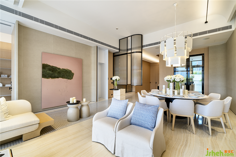 別墅裝修設(shè)計(jì)空間主格調(diào)為低飽和度的白色和暖色系,精簡(jiǎn)干凈,卻不寡淡。大型畫作,看似隨意實(shí)則精心陳列,散發(fā)出濃郁藝術(shù)氣息與生命力。