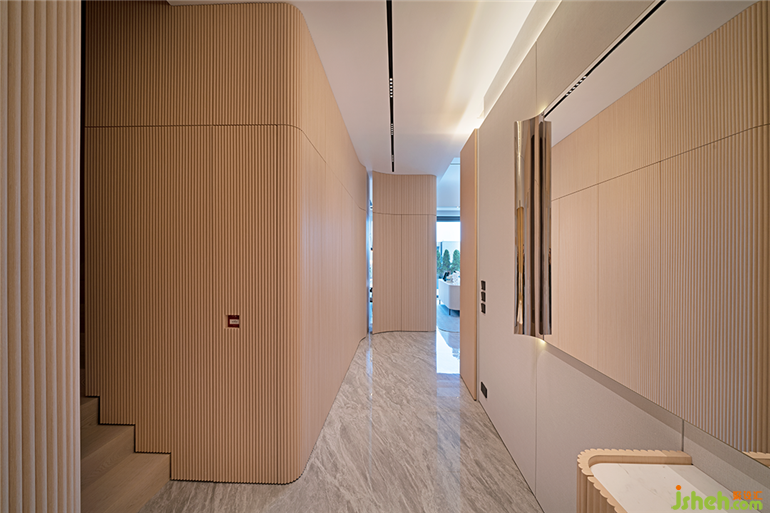 香港駿嶺薈私宅設(shè)計(jì)的首層設(shè)置為公共區(qū)域。從歸家的電梯入戶后的走廊和玄關(guān)的精心布置開啟:半開半合的設(shè)計(jì)兼具空間功能分區(qū)與完善的收納體系。緩緩走入,漸漸卸下平日里快節(jié)奏高強(qiáng)度的身心狀態(tài),輕盈地進(jìn)入屬于自己的生活容器。
