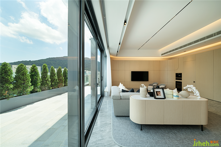 美好的生活與自然是密不可分的。陽臺上整齊栽培的樹木與黛綠遠(yuǎn)山形成呼應(yīng),香港駿嶺薈私宅設(shè)計(jì)透過落地玻璃窗交相輝映,仿佛綠意和空氣一起飄散入室。即使沒有戶外大花園,也可以在室內(nèi)擺放鮮花綠植,將自然引入于方寸之間,增添幾分生機(jī)盎然。