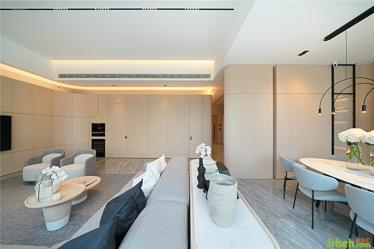 消隱的墻體隔斷,讓居住體驗(yàn)更為流動(dòng)與開闊,開合有序,香港駿嶺薈私宅設(shè)計(jì)大量的隱藏式柜體收納與生活電器的內(nèi)嵌設(shè)置,滿足實(shí)際生活應(yīng)有的功能性,空間更顯干凈簡約,素樸大氣。