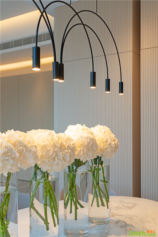 圓弧形與倒角的元素大量使用,弱化了部分立面墻體與個(gè)別材質(zhì)的鋒利冰冷,香港駿嶺薈私宅設(shè)計(jì)流暢的線條感亦展現(xiàn)出舒適松弛的空間語言。