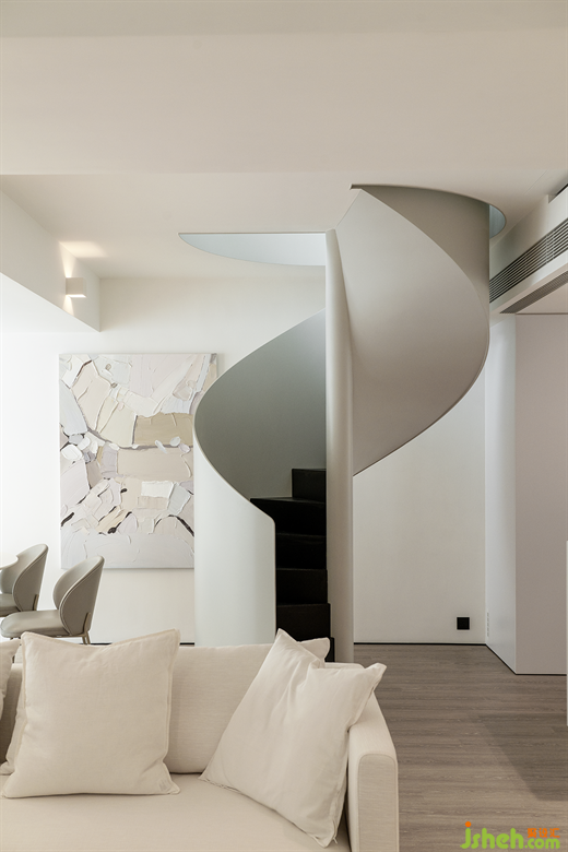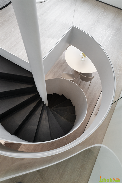 簡(jiǎn)約黑白造型的旋轉(zhuǎn)樓梯,優(yōu)美的弧線和極致工藝彷佛一件藝術(shù)品佇立于此,橫向和縱向點(diǎn)亮了每個(gè)留白的空間,其空間的生命張力令人驚喜,隱隱滲透著家的無窮力量。
