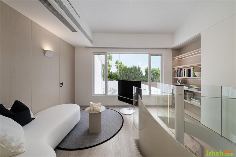 二層為休息區(qū)域,整體延續(xù)了簡(jiǎn)潔靜謐的空間調(diào)性。香港獨(dú)立屋設(shè)計(jì)沿著旋轉(zhuǎn)樓梯徐徐向上,先是進(jìn)入私人休閑小客廳。這里的功能不被定義,自由隨性,可以是夏日午后的獨(dú)處閱讀,也可以是冬日周末的沉浸式看電影...