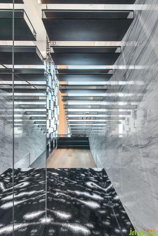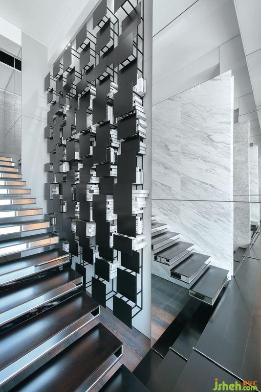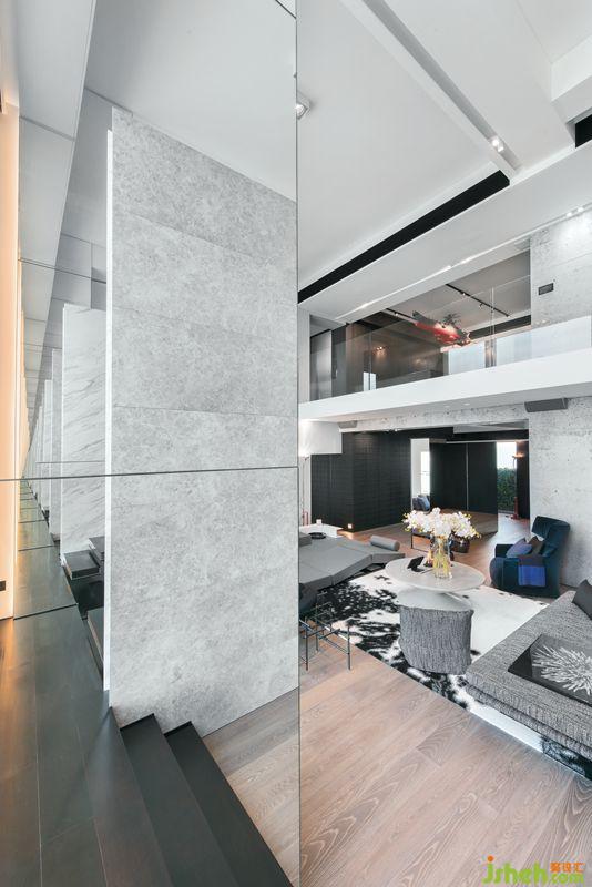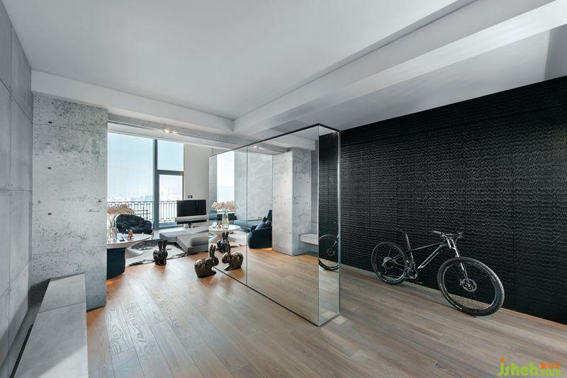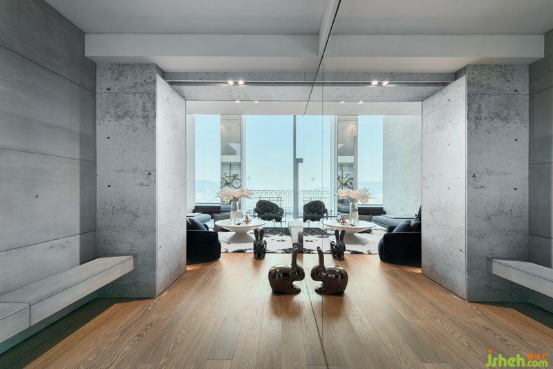 左邊的水泥板與右邊的深色雕刻墻面相照應