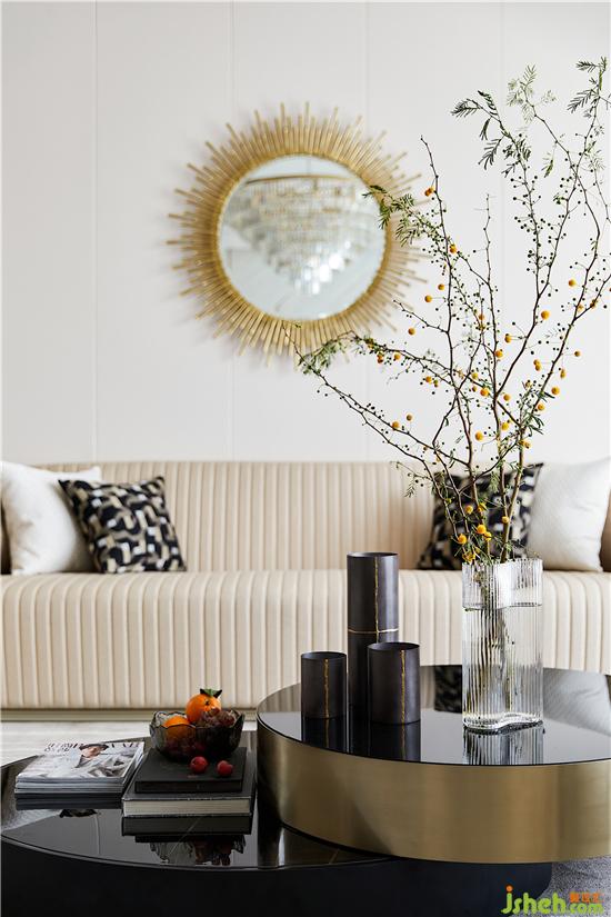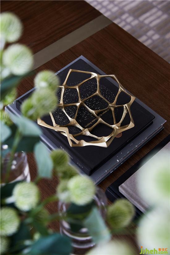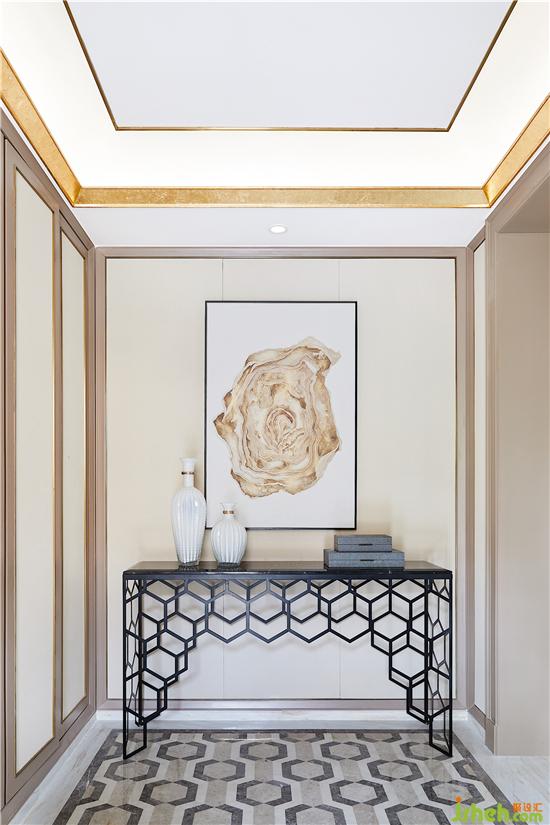 在玄關,圍繞主題展開的蜂巢造型端景臺,通過幾何變換延伸出輕盈別致的藝術性。裝飾畫似金色玫瑰優(yōu)雅綻放,又仿若花蜜清瑩欲滴,恰到好處點綴了空間的視覺中心,勾勒出彬彬有禮的迎迓場景。