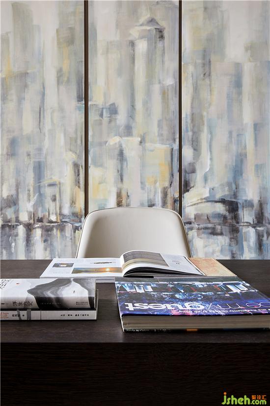 書房位于主臥套房中,空間井然有序,頂天立地式書櫥陳列著居者的藝術(shù)藏品,身后柜門上抽象手繪畫更是將溫厚的人文氣質(zhì)刻畫得淋漓盡致,書中錦繡三千,任居者肆意揮灑。