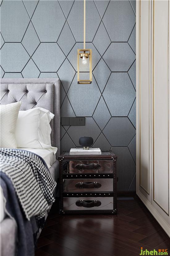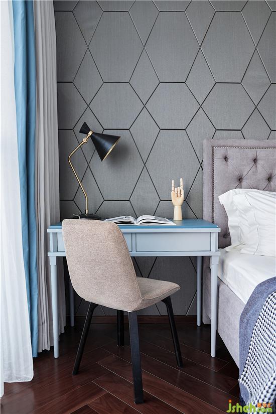 男孩房床頭背景是經(jīng)過變幻后的蜂巢概念,規(guī)整的幾何排布益于孩子思維的拓展開發(fā),不同色塊的組合與千鳥格的搭配,是一種潛移默化的美學投射,孩子自由成長不受限。