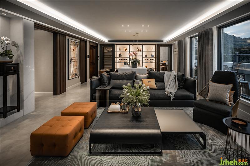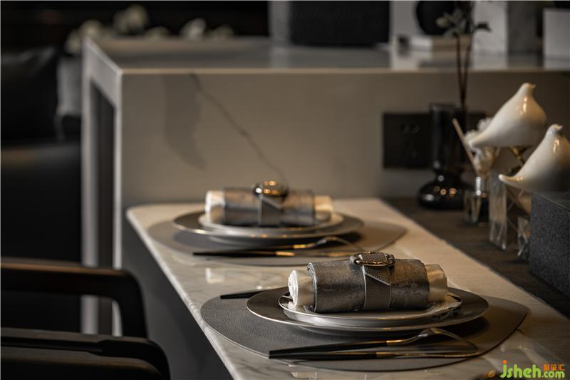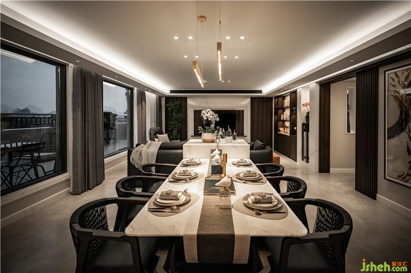 客廳與餐廳沒(méi)有任何隔墻的設(shè)計(jì),不論是坐哪都能看到電視,去掉繁雜,保持著大空間,在軟裝色調(diào)上也保持著統(tǒng)一。
