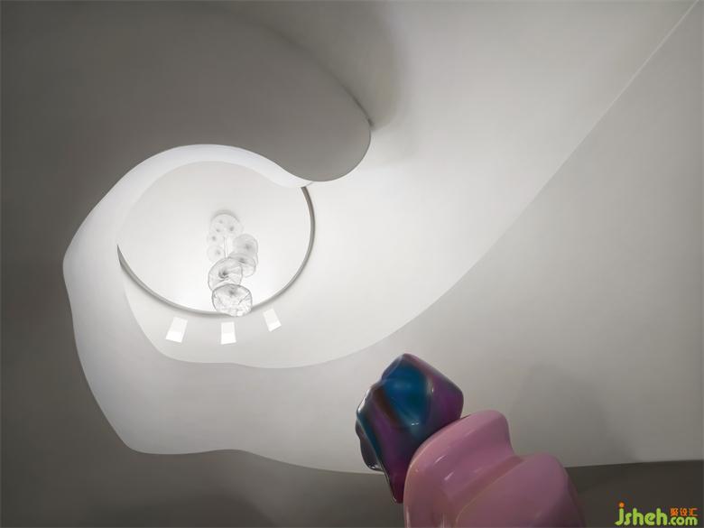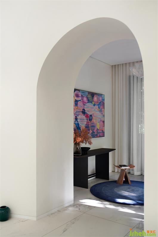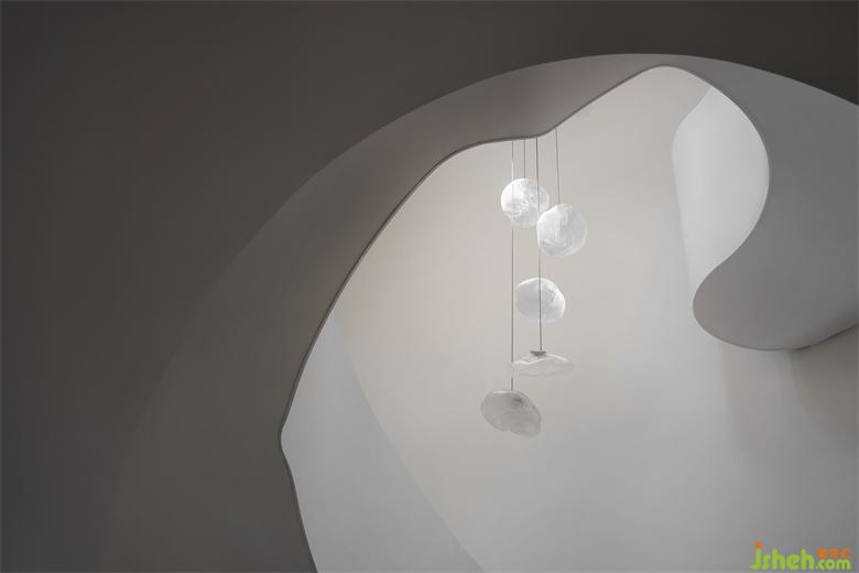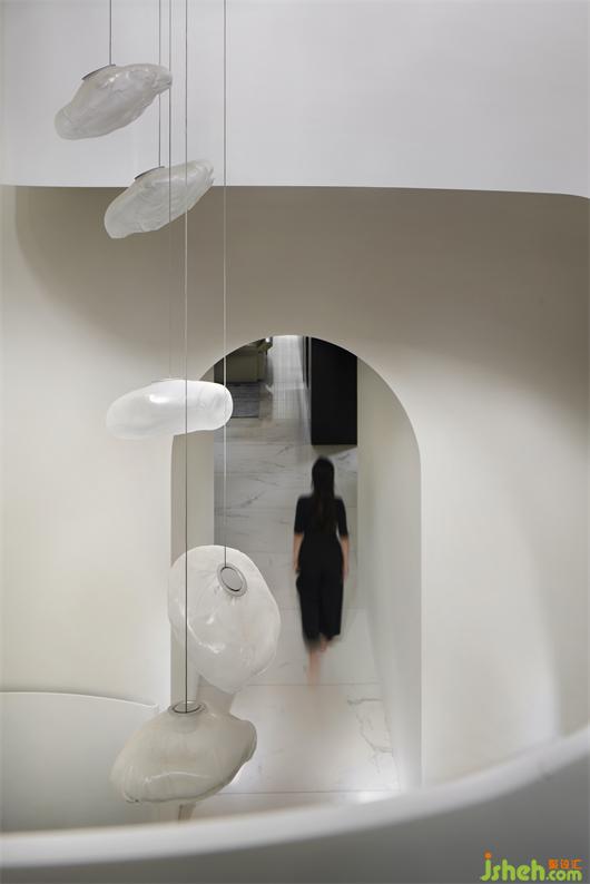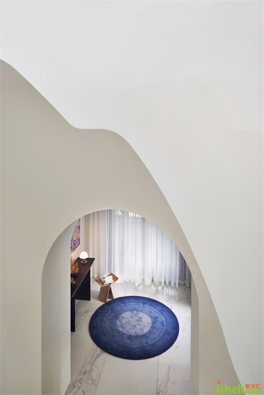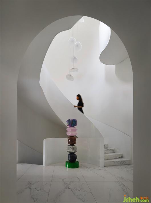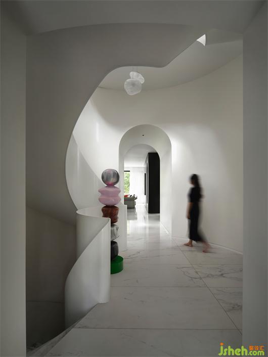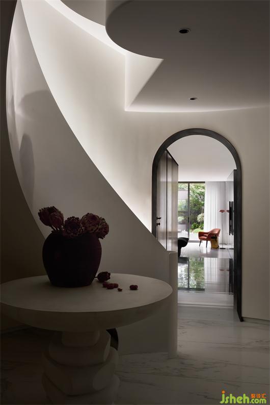 別墅設(shè)計以純潔的白色為空間底色,貫穿空間的弧形的線條就如自然生長一般,在日光的漫射下,光的神奇力量讓一種難以言喻的奇妙氛圍呼之欲出,一個圣潔的場域呈現(xiàn)于你眼前。