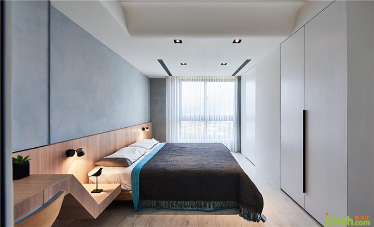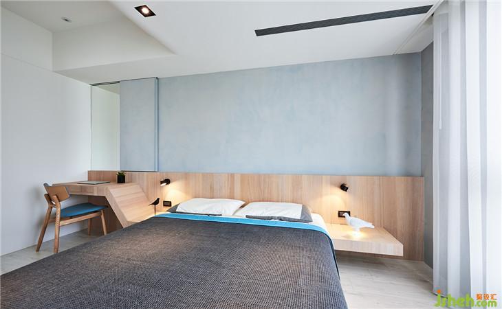 主臥床頭墻面,也是硅藻土材質(zhì)調(diào)成藍(lán)色,墻面也隱藏一個(gè)拉門,拉開底下就是鏡子功能。