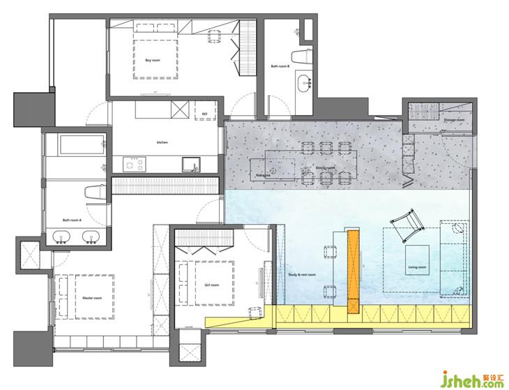 屋主好客喜歡三五好友一起到家里喝酒聊天,所以我們就規(guī)畫了一個大中島在視覺中心,可以坐10-12人的尺寸, 客廳與書房利用電視柜做區(qū)隔, 窗邊臥榻串連這兩個空間,但又彼此有獨立性。