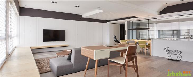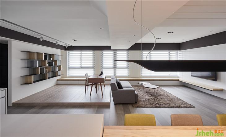 書(shū)房及客廳間我們只利用地板的高低差做界定,讓視覺(jué)完全通透。