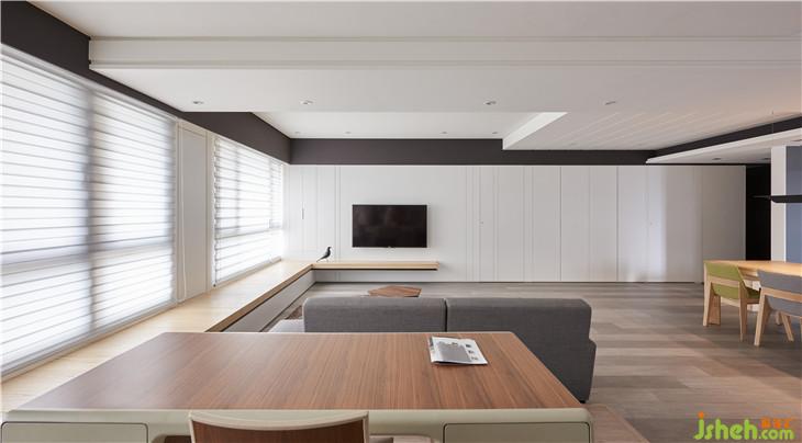 電視墻藉由不規(guī)則分割線,將背后房間的門(mén)片也隱藏起來(lái)了,讓公私領(lǐng)域完全一分為二。