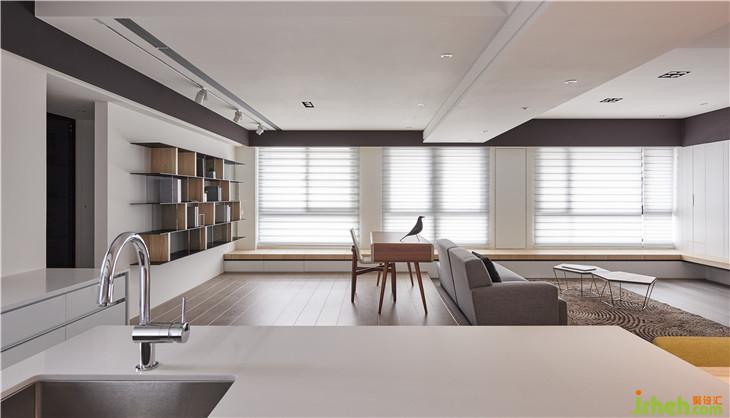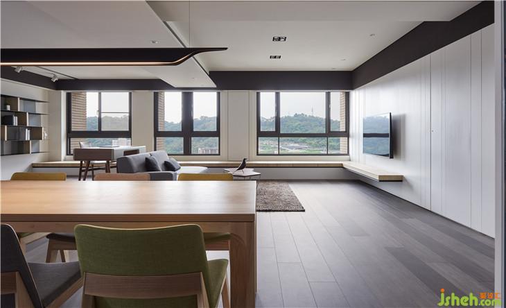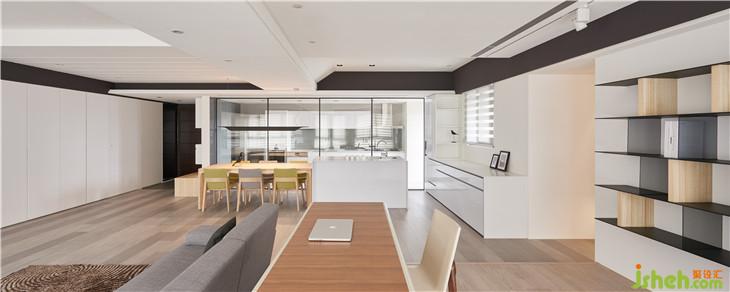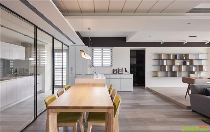 從書房往廚房看,餐廳用中島嶼實木活動餐桌的結(jié)合,變成一個可以寬廣的用餐空間