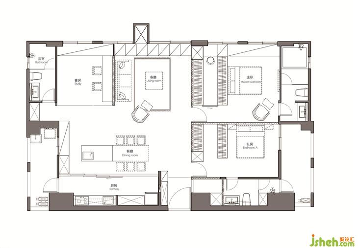 從書房往廚房看,餐廳用中島嶼實(shí)木活動(dòng)餐桌的結(jié)合,變成一個(gè)可以寬廣的用餐空間