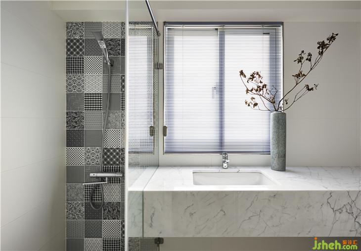 簡潔的廁所空間延續(xù)外面中島的大理石臺面量體感