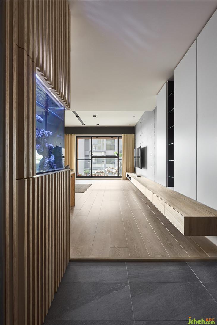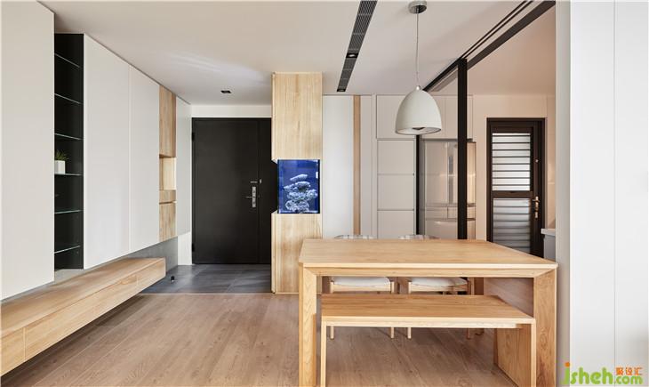 入口玄關(guān),客戶希望養(yǎng)海水魚(yú),所以我們就將魚(yú)缸跟鞋柜整合在一起,因?yàn)轲B(yǎng)海水魚(yú)必須要有專門的設(shè)備及通氣系統(tǒng),我們干脆將門片設(shè)計(jì)成隔柵可以兼具透氣及造型