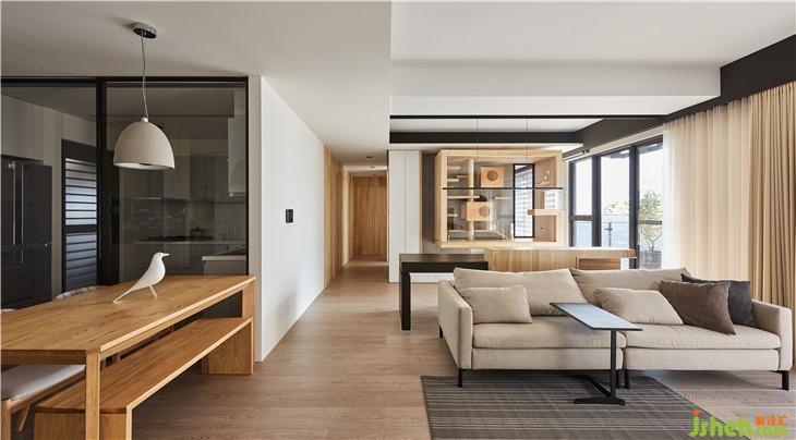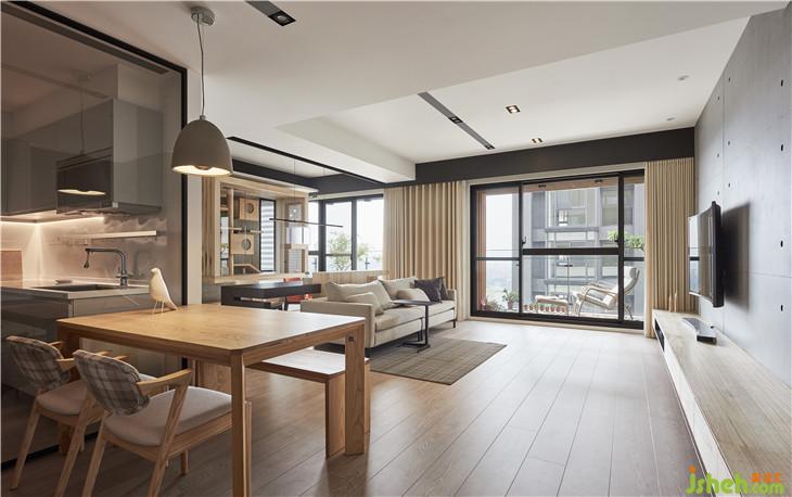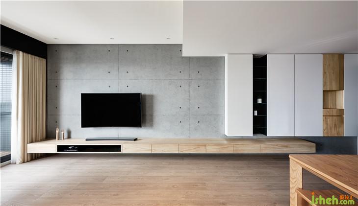 客廳電視墻設(shè)計(jì)為清水模質(zhì)感,右方柜體是玄關(guān)柜的延伸