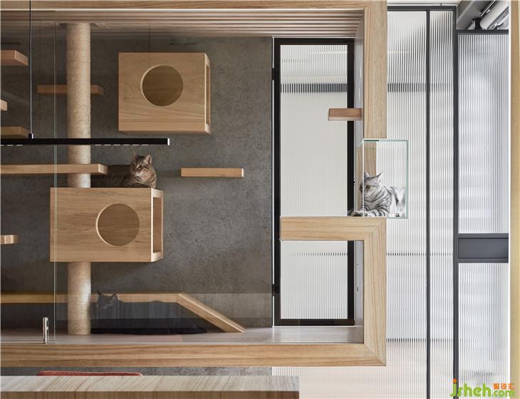 屋主養(yǎng)了四只貓,希望家里的貓有他們的窩,可以靠近窗戶讓他們看風(fēng)景,又可以讓屋主可以跟他們互動(dòng),于是我們?cè)O(shè)計(jì)了一個(gè)懸浮的玻璃盒子,讓貓窩也變成一種展示
