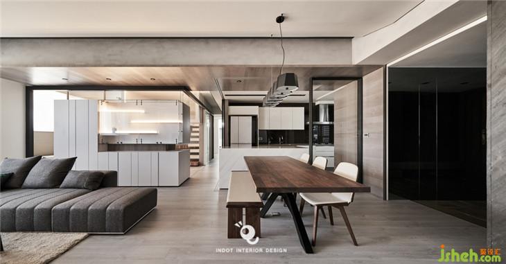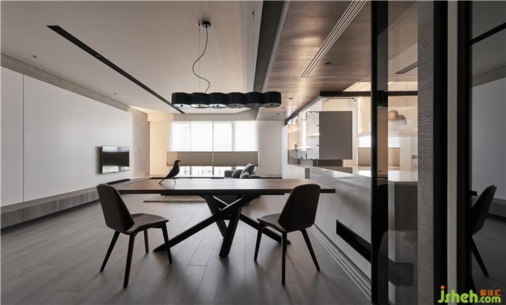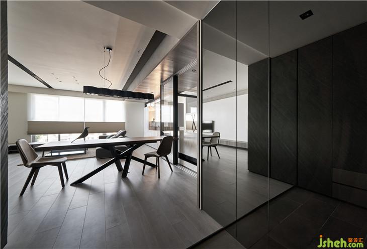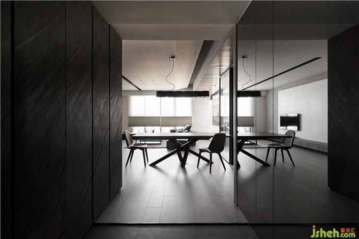 入口側(cè)墻整面的穿衣鏡使用灰鏡,大門一進到空間就看見造型感強烈的桌子,也變成一個視覺端景。