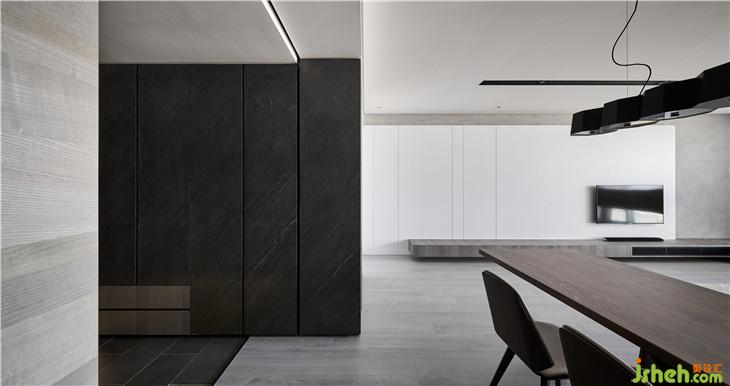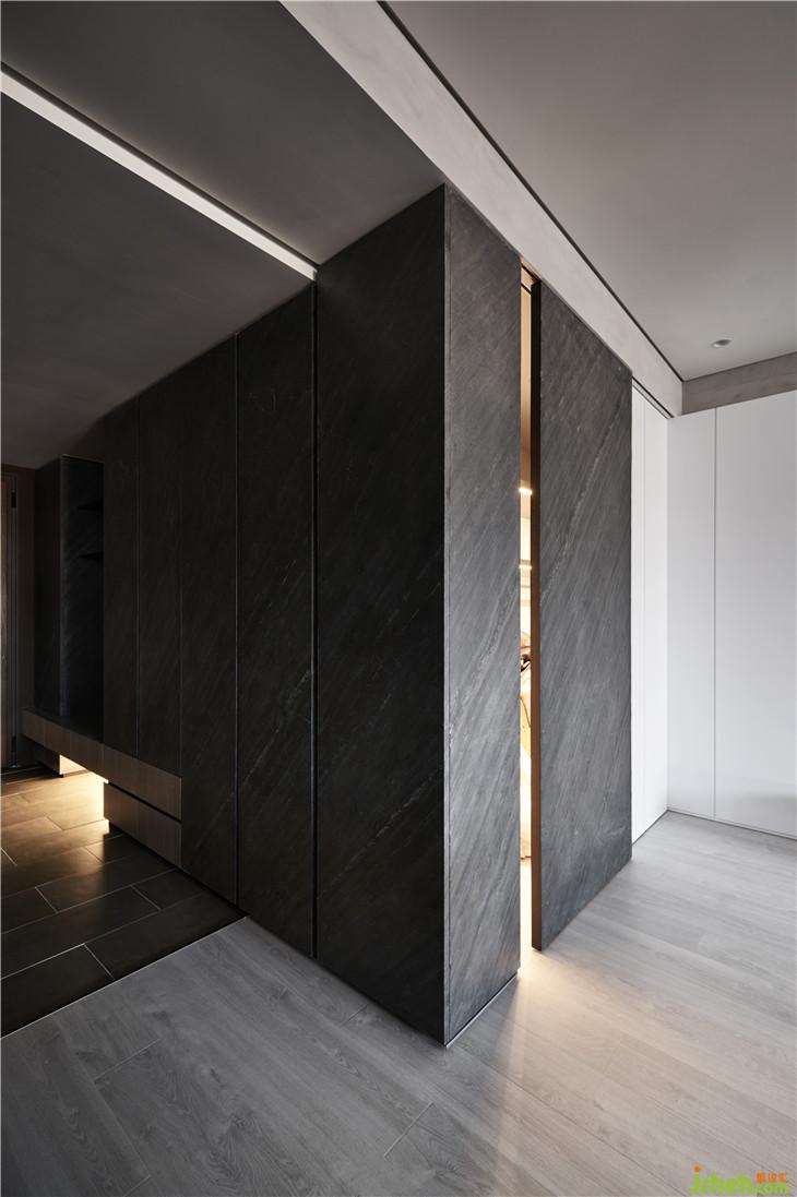 入口鞋柜一直延伸到客廳的儲藏室表面都貼石皮材質(zhì),雖然顏色很重,但我希望營造一進到這空間就像看到一個沉穩(wěn)的石材塊體,然后與客廳這一面的白墻形成視覺的強烈對比,當使用者進入這空間后因為這樣的情境轉(zhuǎn)換,就會有一種豁然開朗的感覺。