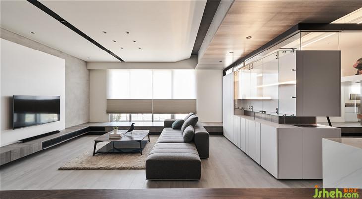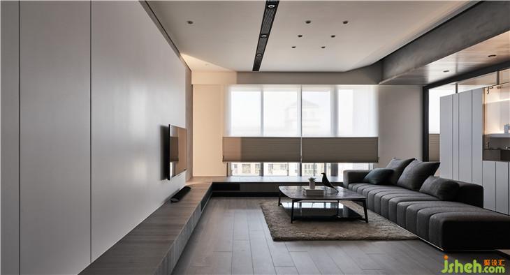 整面干凈的電視墻面,電視柜延伸到臥榻形成一個視覺延續(xù)性。