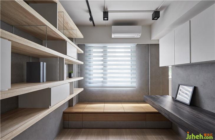 書房側(cè)邊臥榻收納 - 女主人平常畫圖需要較深的桌面,表面也使用美耐板耐刮木紋材質(zhì)