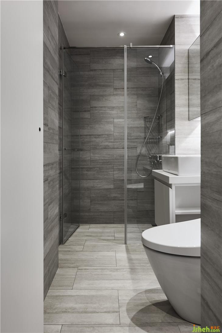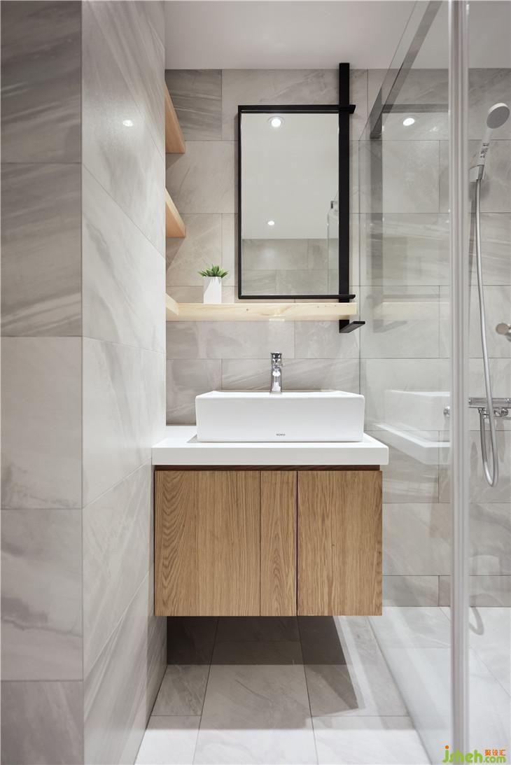 客浴選用水墨紋理的磚,鐵件鏡子與實(shí)木層板結(jié)合,延伸下來的鐵件變成擦手布的掛鉤,實(shí)木層板也可以放置東西