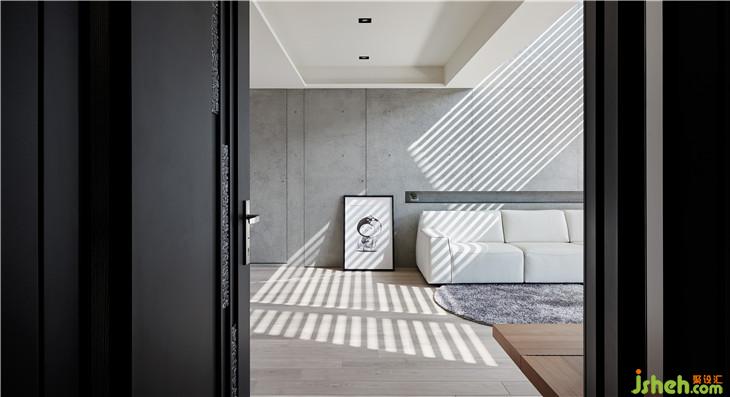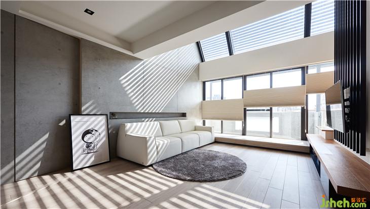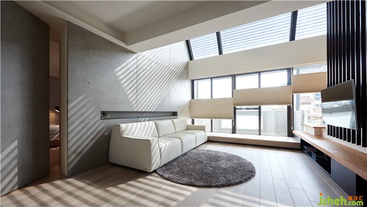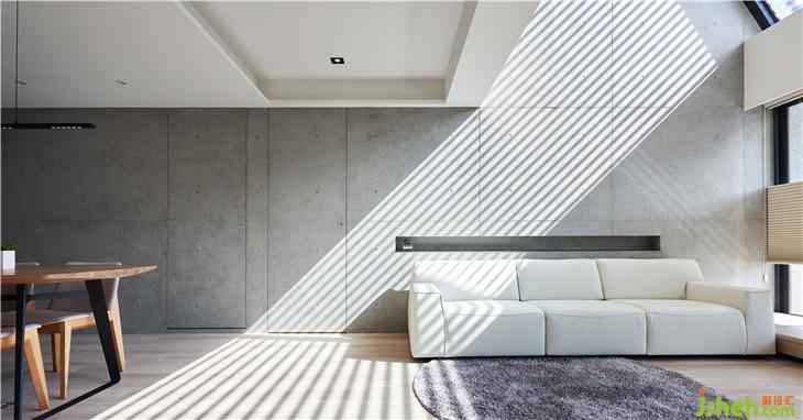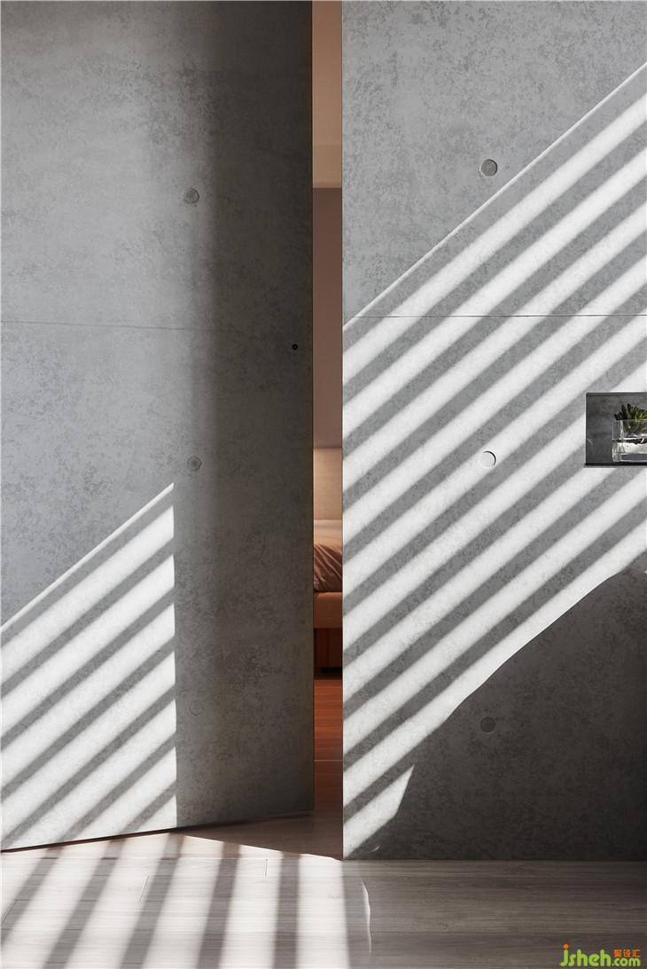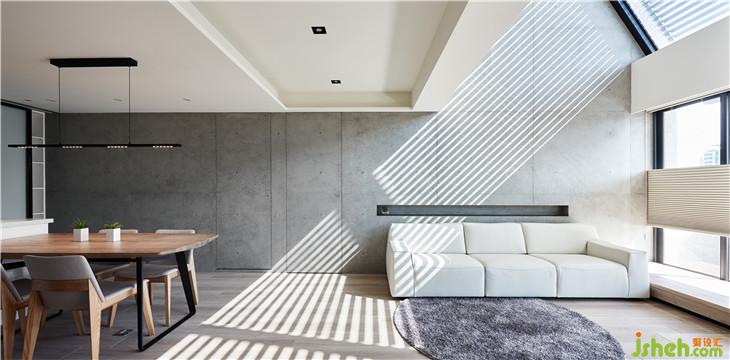 空間的生命力是藉由人、光線、生活所組成,因為有光線,所以人在這里生活著。我們在這復(fù)層空間內(nèi)設(shè)計斜面的天窗,將陽光引導(dǎo)到室內(nèi),陽光因為不同時間點,經(jīng)由玻璃的折射而有不同光影變化,空間也會隨著不同光影產(chǎn)生不一樣的立面表情。 我認(rèn)為光影才是空間中最美的擺飾,空間中貫穿上下樓層的清水模墻面就是最美的畫布,似乎在述說著這個空間的故事。