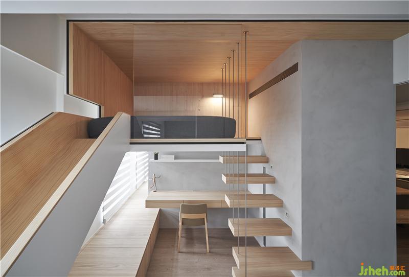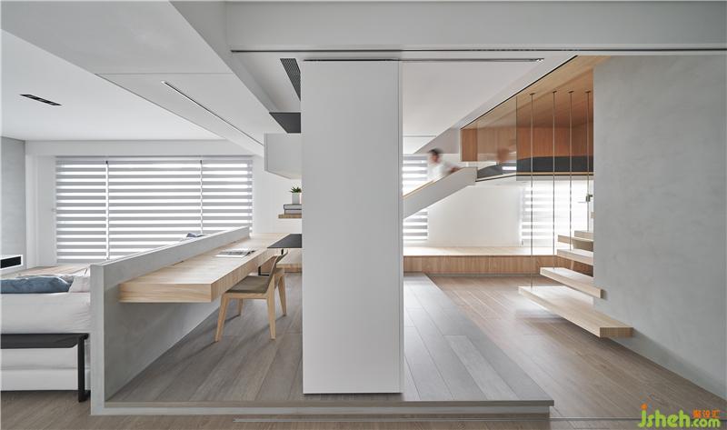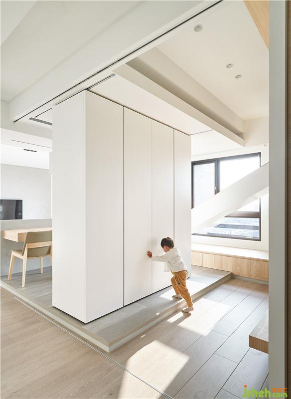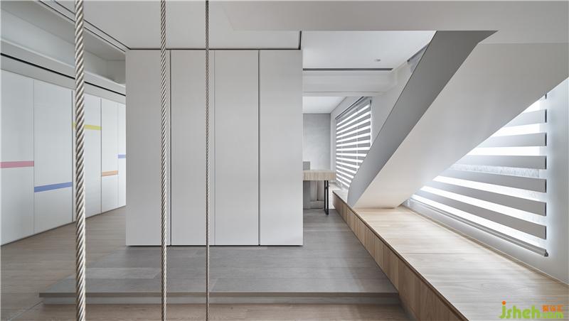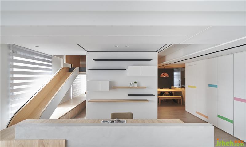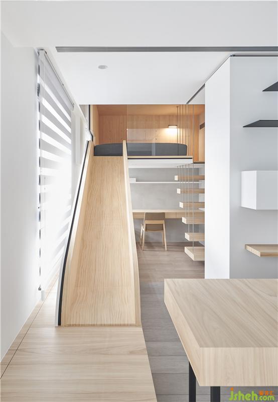 屋主希望他們家可以很有趣讓小孩快樂成長,討論中也發(fā)現他們家的小朋友很喜歡去公園溜滑梯,于是我們就思考為何不能把溜滑梯放進家里呢?所以設計概念上,將小孩房的格局打破,讓睡覺空間放在空中,用折板語匯隱含機翼的意象,置入一個斜坡到客廳,讓小朋友起床就可以滑到客廳。玩 -一直都是最好的學習方式,透過在家里不同移動的方式,讓我們用身體經驗感受空間,生活在這空間的人也會激發(fā)出更多想象力。原來,在家也可以這么好玩。室內設計師