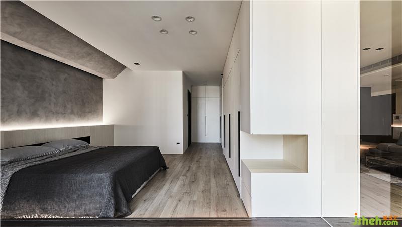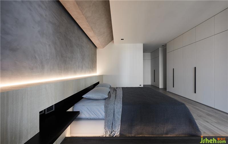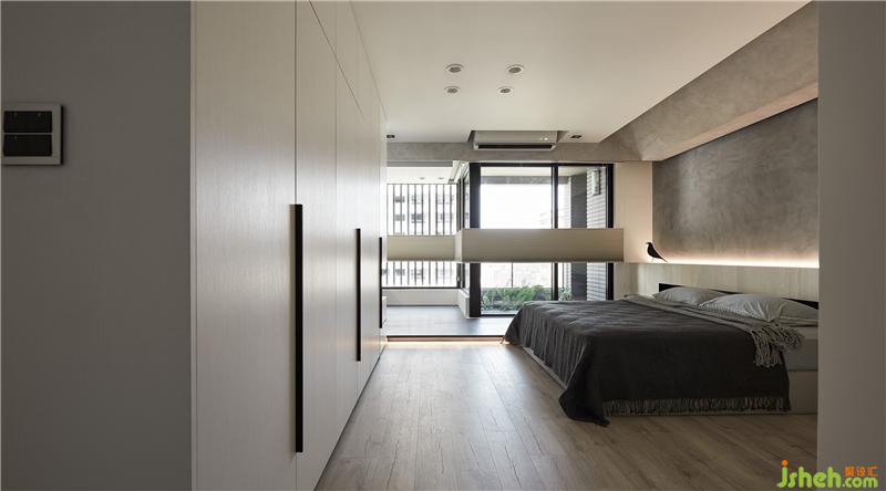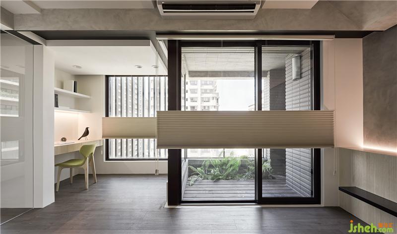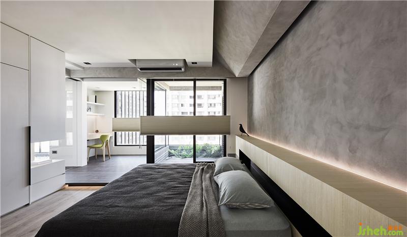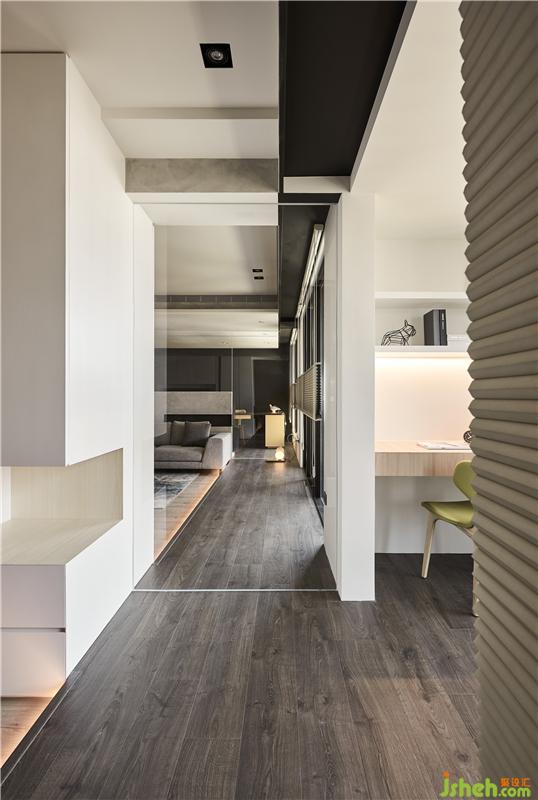 格局設(shè)計(jì)上主要有兩個(gè)重點(diǎn),一是置入玻璃書房,二是打開局部主臥墻面;在設(shè)計(jì)上,利用架高地板延伸了書房,客廳跟主臥,這是我們常用的設(shè)計(jì)手法,但這個(gè)簡(jiǎn)單的動(dòng)作可以讓光線跟空間感更有趣;而收納的部分則盡量集中在兩側(cè)且隱藏于空間中。也因?yàn)榱挚谳^為潮濕,所以這個(gè)空間中運(yùn)用了很多硅藻土涂料,希望能藉由這材質(zhì)調(diào)節(jié)空間中濕氣。室內(nèi)設(shè)計(jì)師