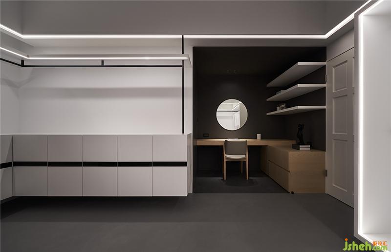 因為三樓有預(yù)留客房,所以二樓原來房間整個就可以變成超大更衣室,不管大衣或是折的衣服都有足夠的空間使用;我們設(shè)計一個黑色色塊空間,變成屋主的化妝空間;更衣室也保留原來窗景,看出去就是舒服的綠樹。
