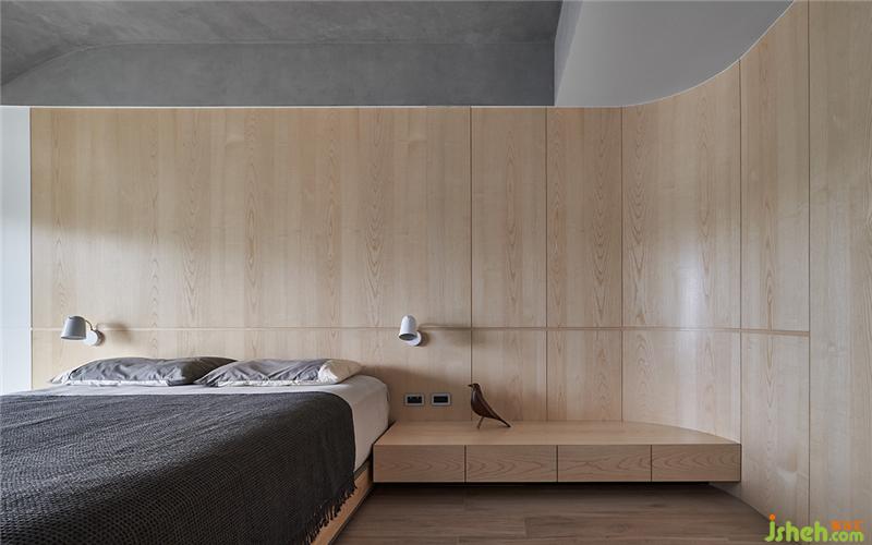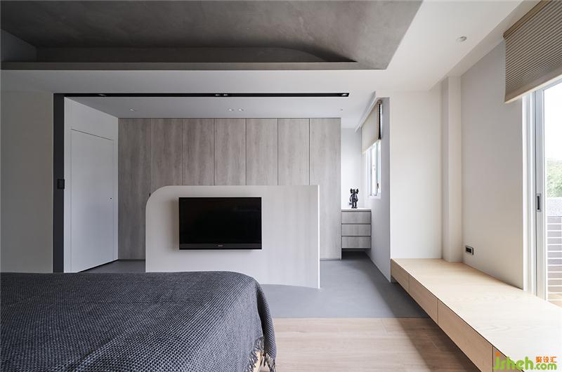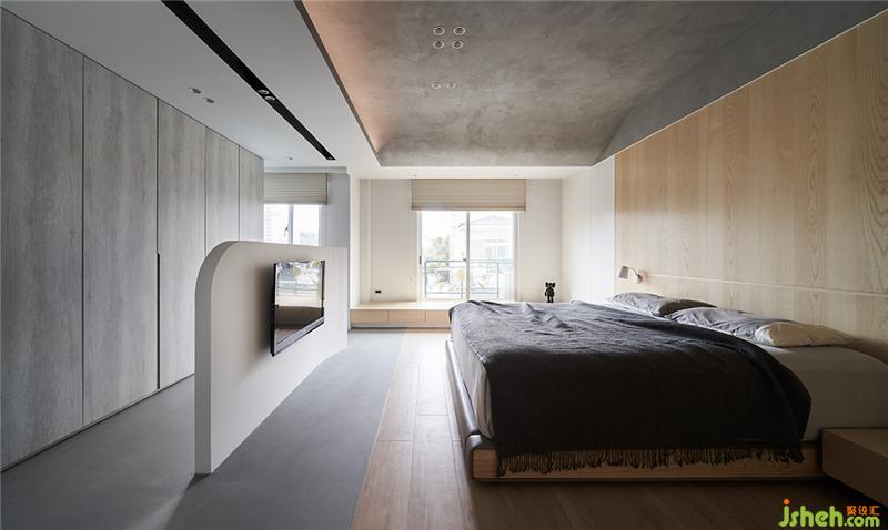 主臥室因為原有深度比較深,所以我們把電視牆往前拉,后方可以坐個簡易的衣櫥空間,地板部分用木紋磚及義大利礦物涂料做界定;天花板延續(xù)一樓的弧形穴居概念,床頭板也呼應(yīng)天花板造型,用一個弧形木皮牆面修飾;窗邊則設(shè)計了一個加寬臥榻與床頭柜整合臺灣裝修設(shè)計。