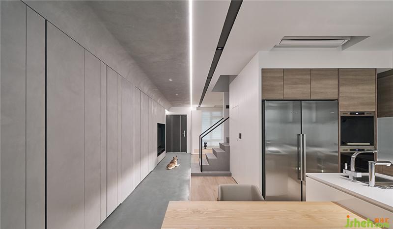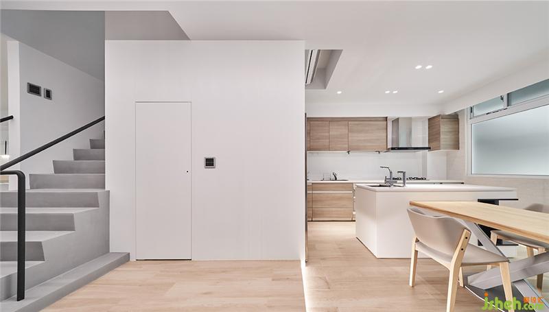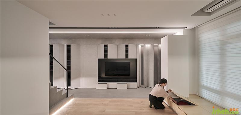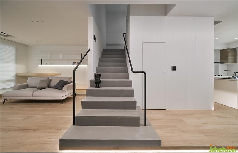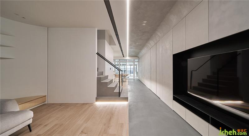 樓梯材質(zhì)一直延伸到一樓地面然后延續(xù)到牆面及天花,有一種蔓延而下的感覺;樓梯左側(cè)為客廳,右側(cè)為開放式廚房。客廳與臥榻、書房整合,臥榻當(dāng)客人多時(shí)旁邊都可以坐一整排;在入口處我們設(shè)計(jì)了一整排收納柜,也與電視牆面跟鞋柜整合臺灣裝修設(shè)計(jì)。