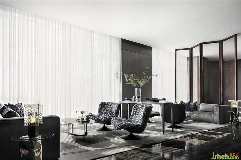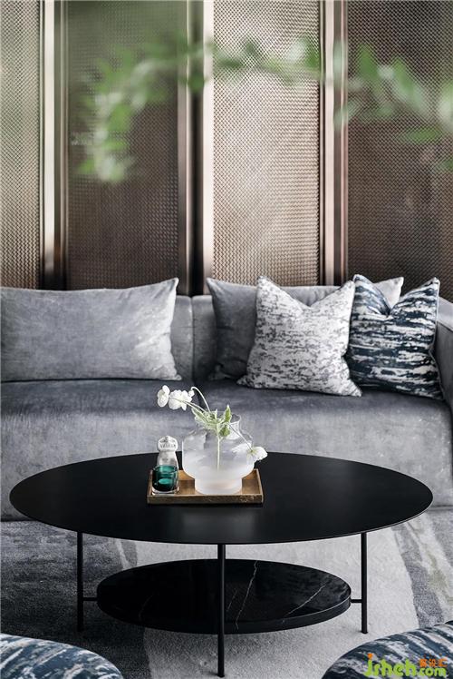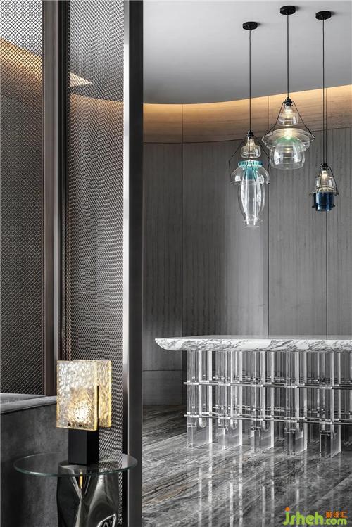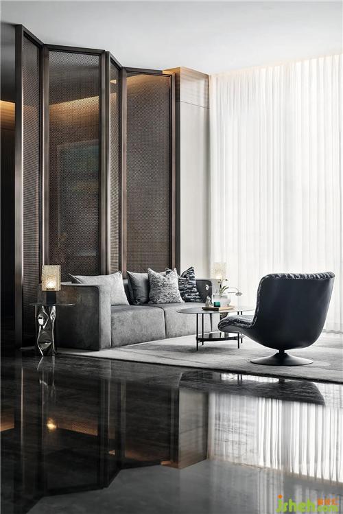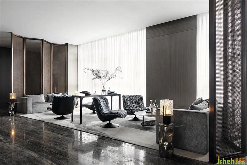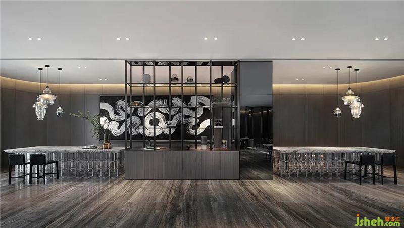 室內(nèi)空間設(shè)計(jì)上體現(xiàn)了雅奢風(fēng)格自然藝術(shù)的細(xì)節(jié)美感,與古人手編席紋的金屬屏風(fēng),彰顯其硬朗紳士的格調(diào),而在軟裝表現(xiàn)上以深色配以水墨的紋樣、絲絨的質(zhì)感,很好詮釋了SCD雅奢的精髓。