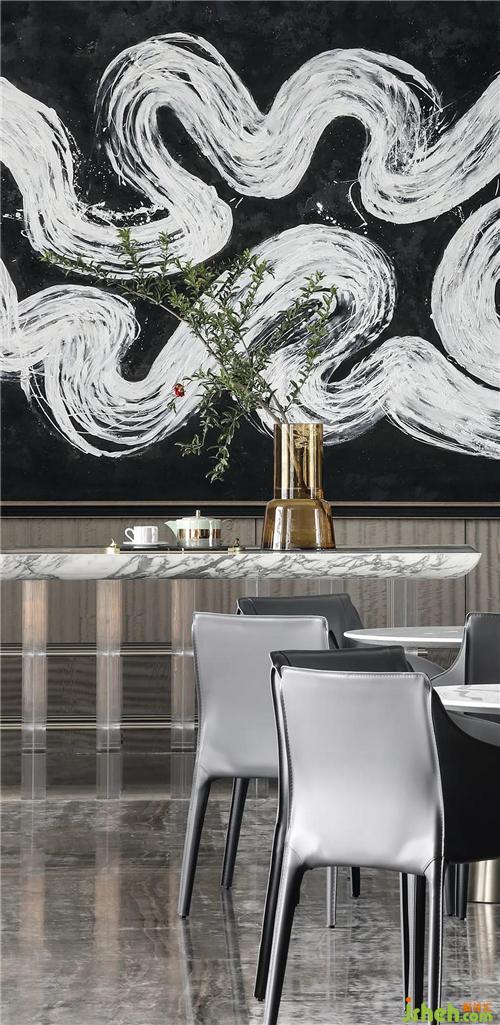 裝飾畫用一個(gè)“舞”的形態(tài),詩意地詮釋了空間意識(shí),在西安這座千年古都的城市,在空間呈現(xiàn)中國的書法與繪畫的結(jié)合,表現(xiàn)了當(dāng)代人喜歡的飛動(dòng)不羈的舞姿。西安售樓處設(shè)計(jì)“舞”是最高的韻律、節(jié)奏、秩序、理性,SCD用簡練的大幅水墨畫勾畫出詩意夢(mèng)幻的空間,在洽談區(qū)與水吧區(qū)之間營造出豐富的轉(zhuǎn)折、對(duì)景、視線、游走的關(guān)系。