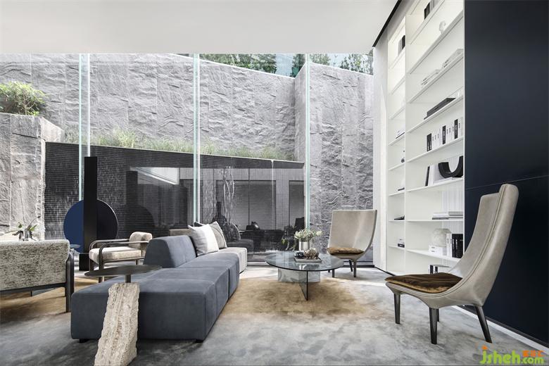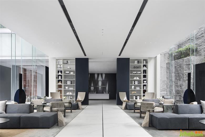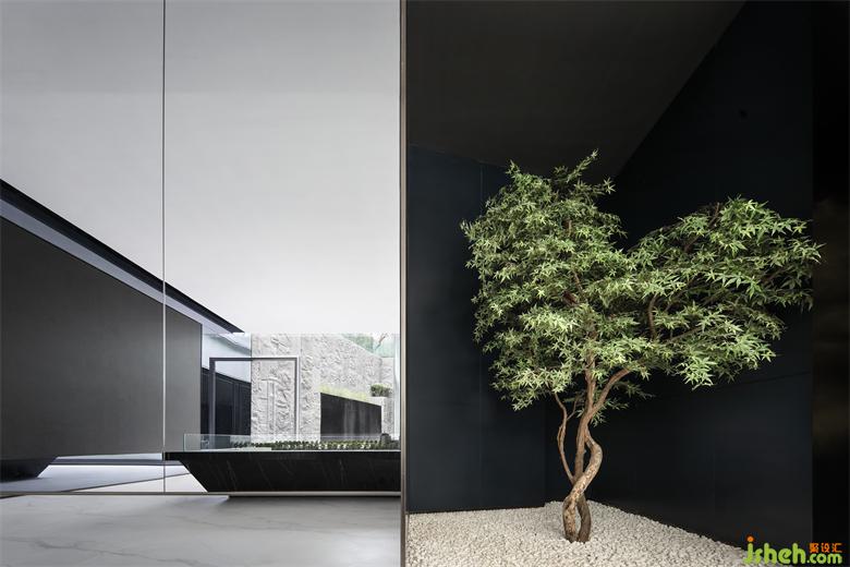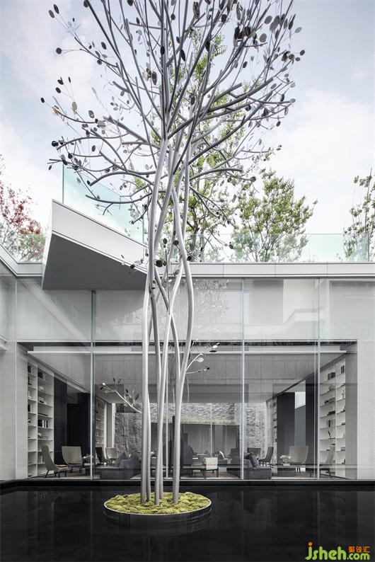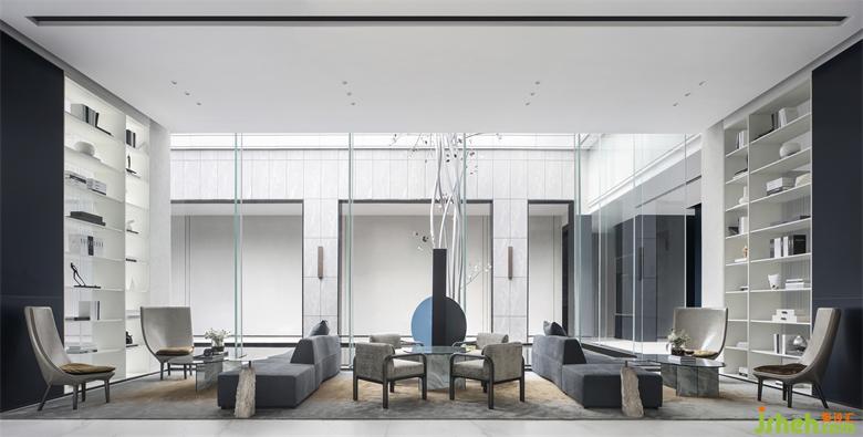 洽談區(qū)簡潔界面與和諧比例共同營造出的柔性向度,隔離了外界喧囂,使觀者逐漸平靜下來。序列、對(duì)稱、圍合、收放、虛實(shí)、造就空間層次。陽光的引入,斑駁交織的光影隨著時(shí)間的推移,在地面、墻面勾勒不同的形色。