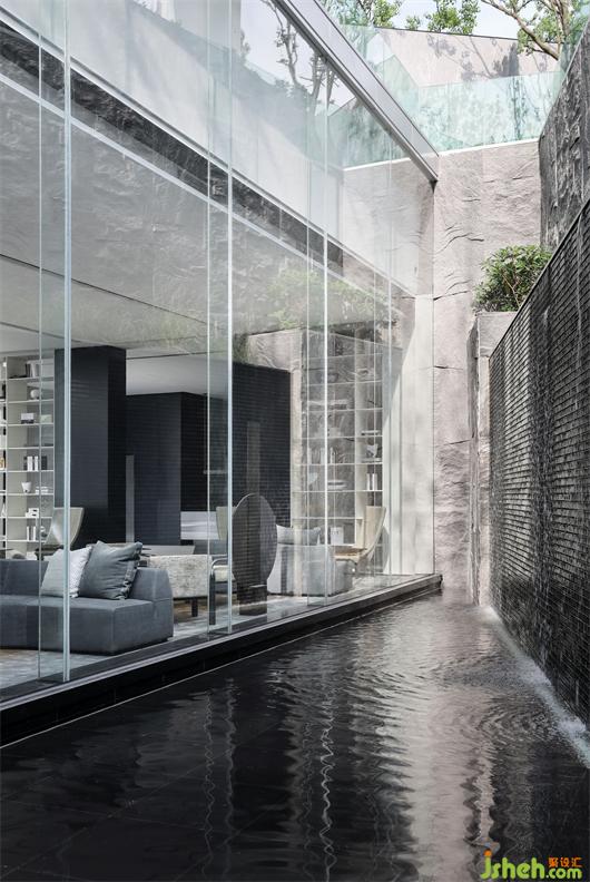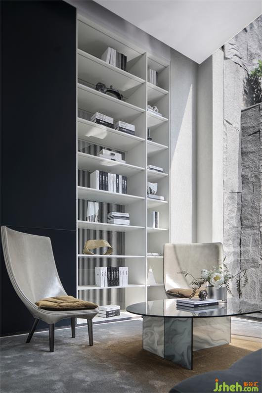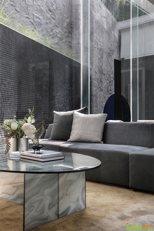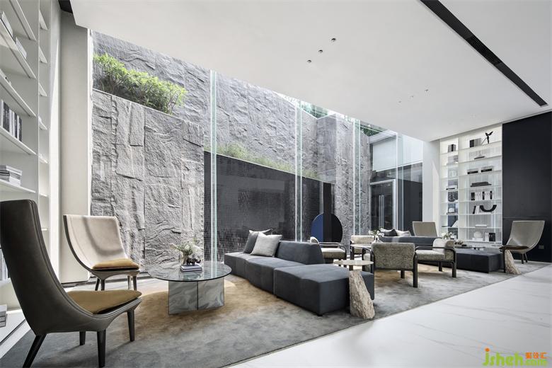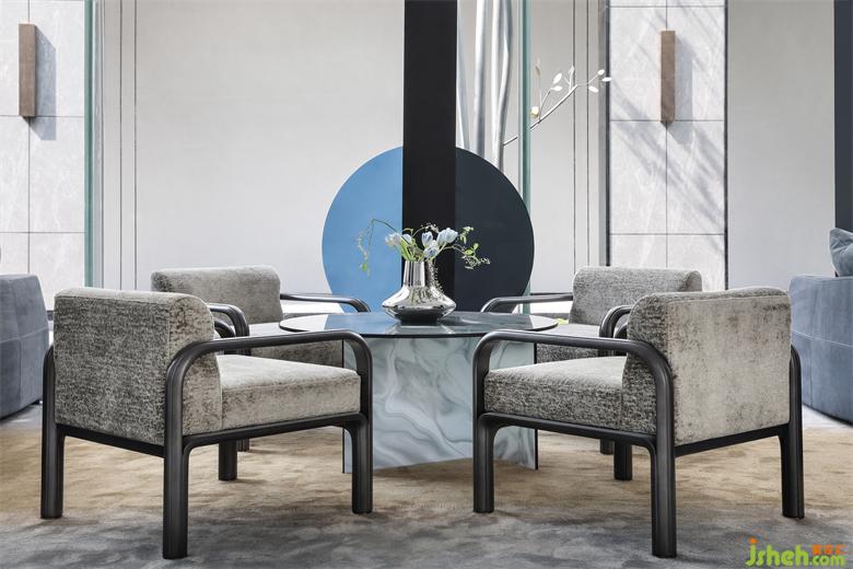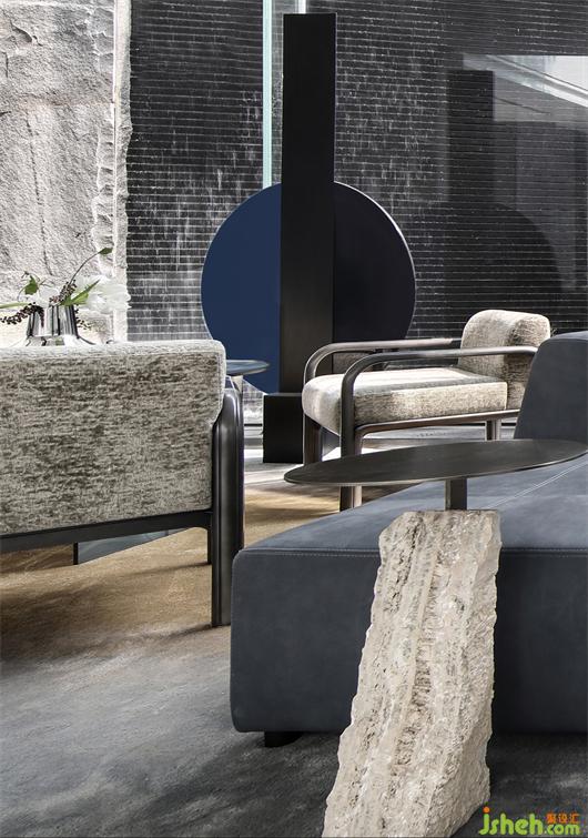 家具的細(xì)節(jié)石雕,互應(yīng)了景觀的山水造景。王安石曰“‘波’乃水之皮”,以水之皮造波瀾,堅(jiān)如石,柔如波,質(zhì)地與形態(tài)的碰撞是交融。這樣的一個(gè)洽談茶幾,亦玩味出了中國(guó)文人心中的水墨山水?!吧綏入[”這種寫意的表達(dá)手法,也讓人頓悟設(shè)計(jì)不僅是樣式、造型、材料這些維度。它更是人心中對(duì)于山水、自然和理想生活的寫照,打破了設(shè)計(jì)的冰冷與傲慢,變得詩(shī)意且溫暖。