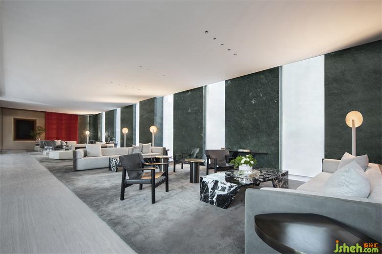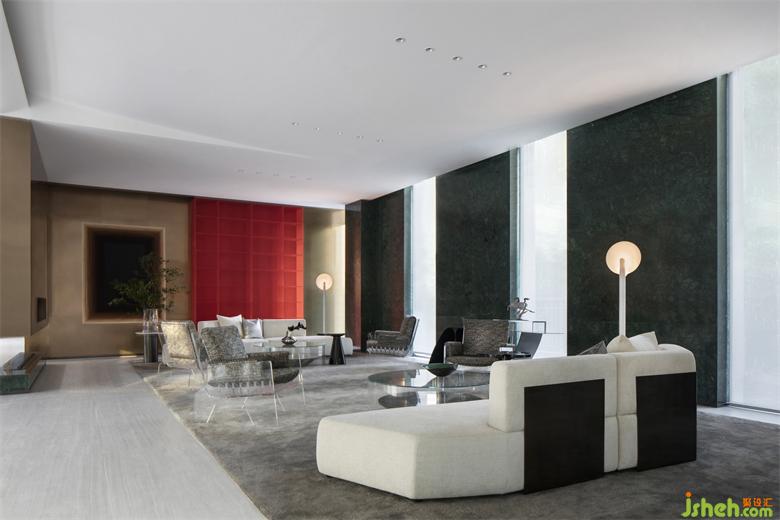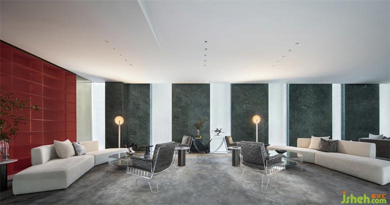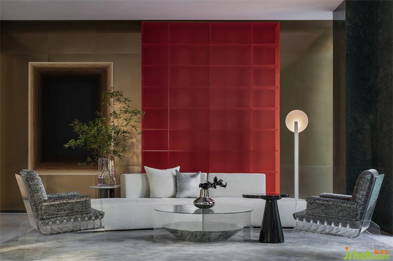 營銷中心設計空間打破傳統(tǒng)意義上的平面格局,布局形成視覺上的延伸,由氣韻生動的中國紅點綴,激活整個場域的氛圍感。揚州這座歷史文化名城詩意棲居的煙火氣,東方美學的古今相繼,既承載歷史又接納現代奢雅趣味,經由設計的推演,空間貫穿著詩學的想象力,勾勒出一幕幕談笑風生。