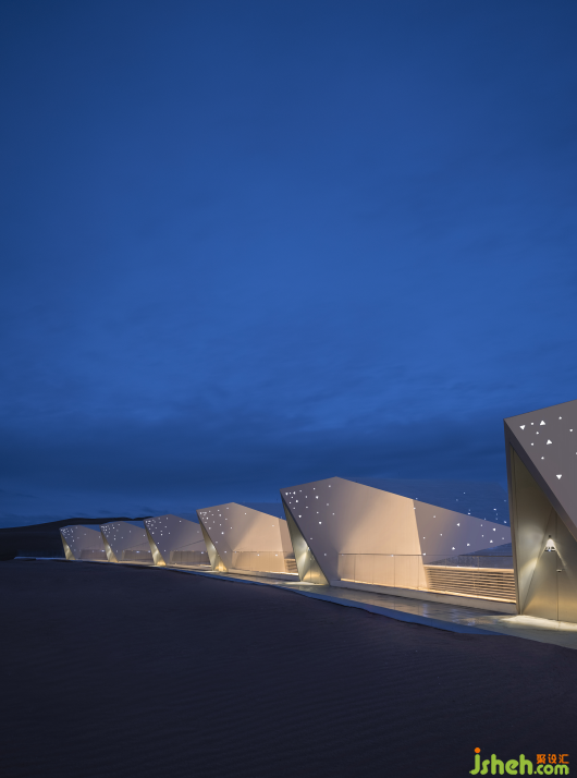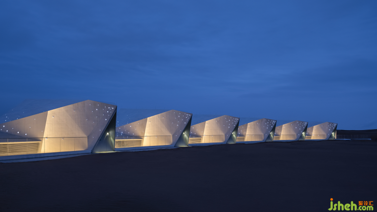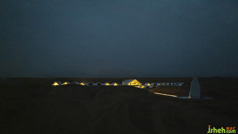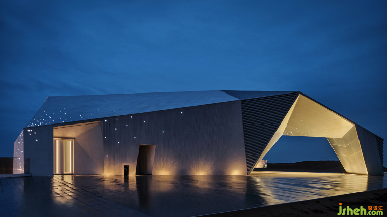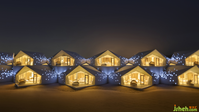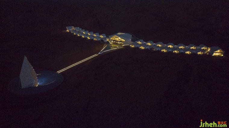 像藝術家一樣思考的設計師,其設計作品是一種獨特氣質的獨特結果。杜恒在接手酒店設計任務之前,她來到這片沙漠考察,微醺時在觀星谷看星星,星影搖搖欲墜,她隨口說了一句“星星落下來,會落到哪里呀......”她體驗到了梵高那句話的意境:“我不知道世間有什么是確定不變的,我只知道,只要看到星星,我就會開始做夢”。在沙漠漆黑的夜晚,如果有會發(fā)光的房子,接住倏然落下的星星,會不會很美?后因業(yè)主方明確要求,要打造一座全球唯一一個沙漠婚禮基地的酒店,時任業(yè)主方主管設計管理工作的李雷先生同杜恒一起,想到了鉆石的主題,將這片狹長的建設用地做成一串閃耀的鉆石項鏈,讓愛與美的純粹和沙漠這片廣袤的時空交融。