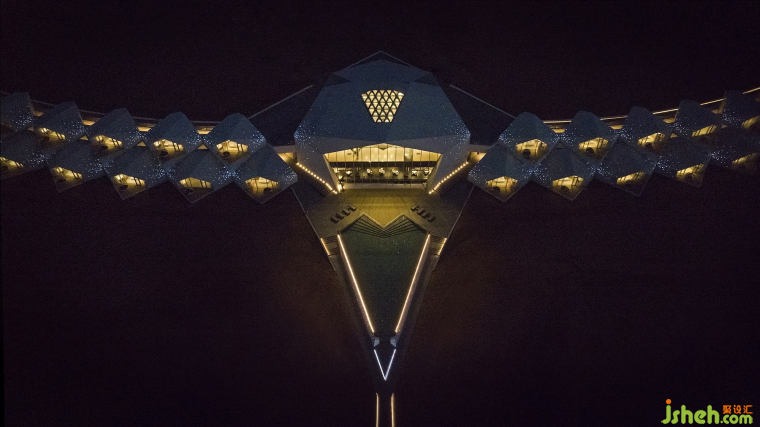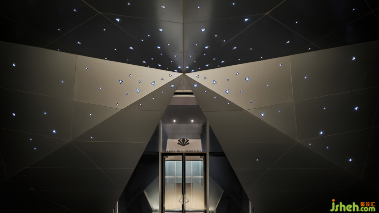 關于這個項目設計之初的整體思考,設計師將沙漠鉆石酒店視為一個可以承載高質量休閑度假和文化藝術交流的空間,杜恒談到2021年梵克雅寶“Sous les étoiles星空下”系列珠寶展發(fā)布會在寧夏中衛(wèi)沙坡頭星星酒店專場展出,構筑起夢幻般的浪漫星空場景,充滿了對浩瀚星空的無限遐想與神秘,共同促成了一場珠寶展的完美演繹。這對她鉆石酒店的設計理念頗有啟發(fā)。星空與鉆石理念的契合既是傳承也是創(chuàng)新。作為沙漠星星酒店二期,鉆石酒店既是代表著沙漠精神的“沙漠中的鉆石之心”,又是中旅國際布局沙坡頭“國際沙漠旅游度假目的地”的新里程碑。杜恒笑言自己是永恒的信仰者,無論是在鉆石禮堂里許下愛的誓言的新人,還是來此度假的旅人,她想為大家營造一種電影感、未來感的沙丘基地視覺畫面,又不失城市生活空間的舒適體驗,這是她思考打造這座具有國際視野和文旅新場景營銷思維的酒店的核心要素。