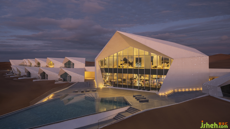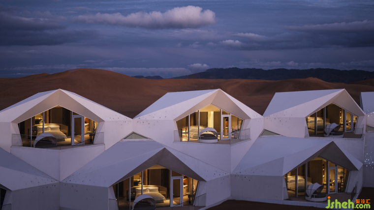 酒店設計落筆沒有試圖去改變沙漠,而是選擇與之和諧共生,利用沙漠的廣袤無垠和光影變幻,為酒店賦予了一種原始而神秘的美感。整個項目以充滿現(xiàn)代科技感與沙漠的自然形態(tài)完美結合,既體現(xiàn)了沙漠的壯麗和寧靜,又刷新了國內野奢酒店的視覺系產(chǎn)品標桿。其次,對顏值經(jīng)濟下渡度假生活的高品質松弛感、自然場域的精神屬性的深刻理解是支撐設計師思考文旅酒店非常重要的又一個起點。旅游消費已經(jīng)進入“顏值經(jīng)濟”、審美新時代,對于自己設計的第一個文旅酒店,杜恒深入挖掘了寧夏文旅IP“星星的故鄉(xiāng)”這一文化元素,引入設計美學、生活美學,講述鉆石的故事,營造極致浪漫想象的場景,讓旅人走進這個故事,喜歡這個場景,且成為故事和場景的參與者、體驗者和共享者。一個好的項目產(chǎn)品不僅要持續(xù)滿足用戶所需,也要能夠持續(xù)產(chǎn)生穩(wěn)定的傳播能力,具備自我持續(xù)獲客推廣能力。這種綜合能力的打造,靠的不僅僅是設計美感,更重要的是設計師對市場需求的熟悉和把握,也是鉆石酒店成功的一個必然因素。